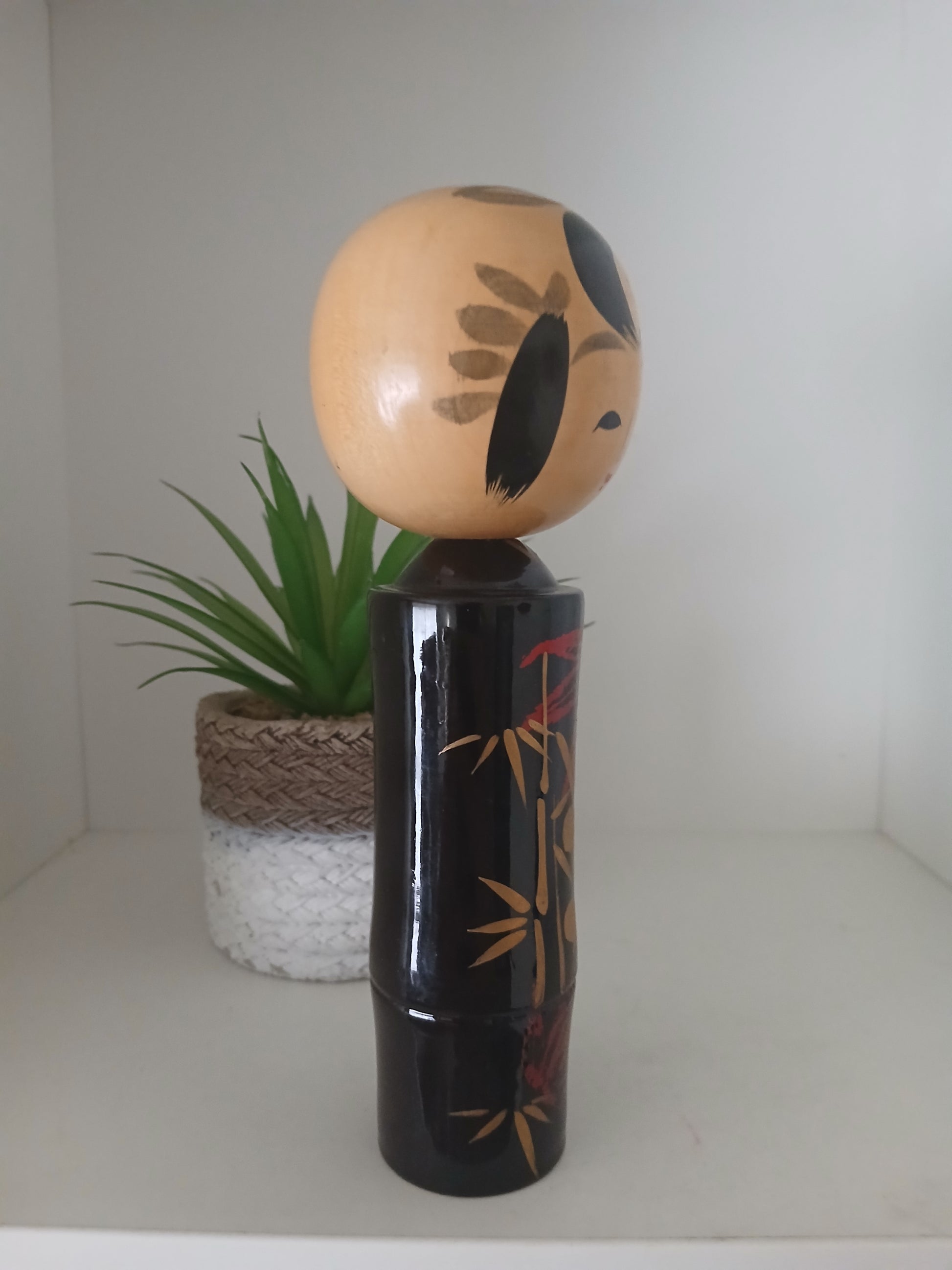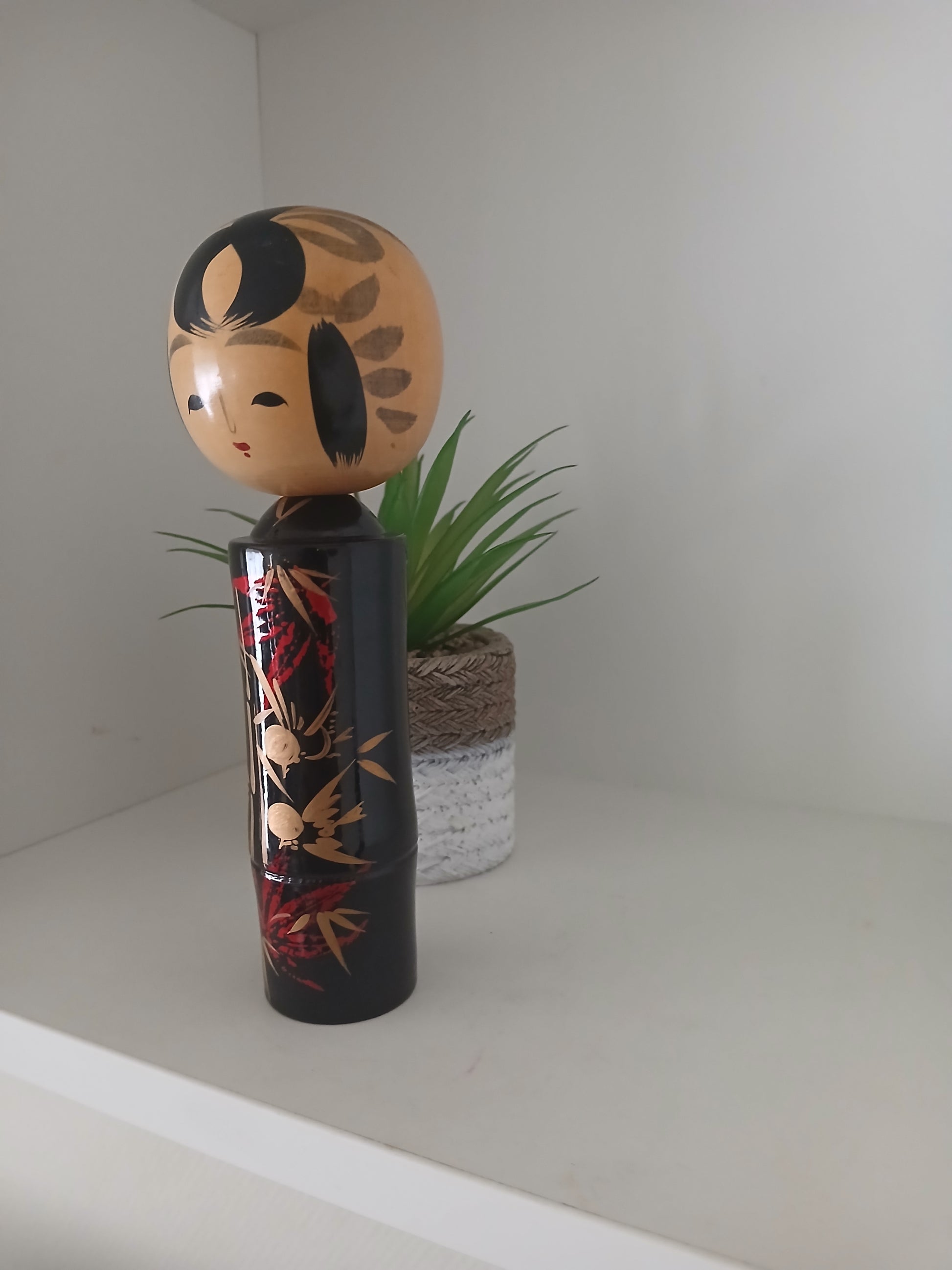 Lovely vintage black lacquer kokeshi by Takahashi Tatsuro, decorated with golden bamboe and 2 birds.