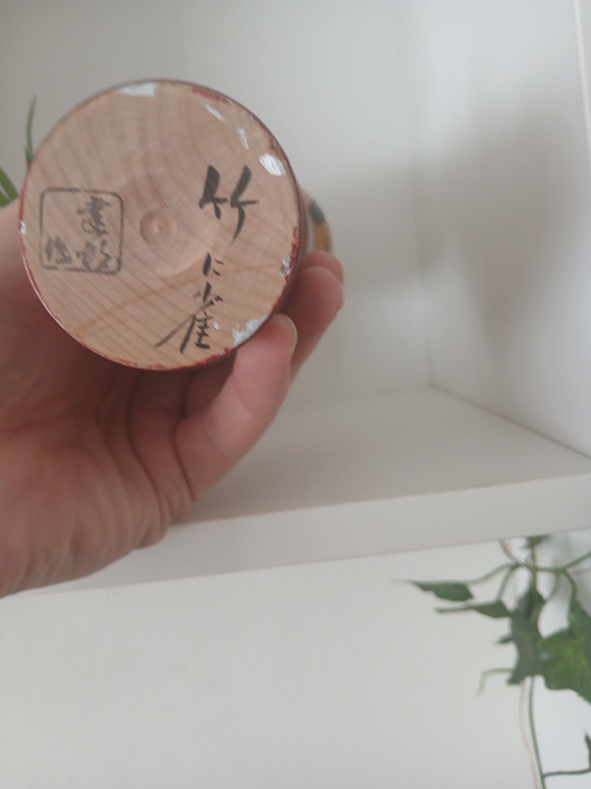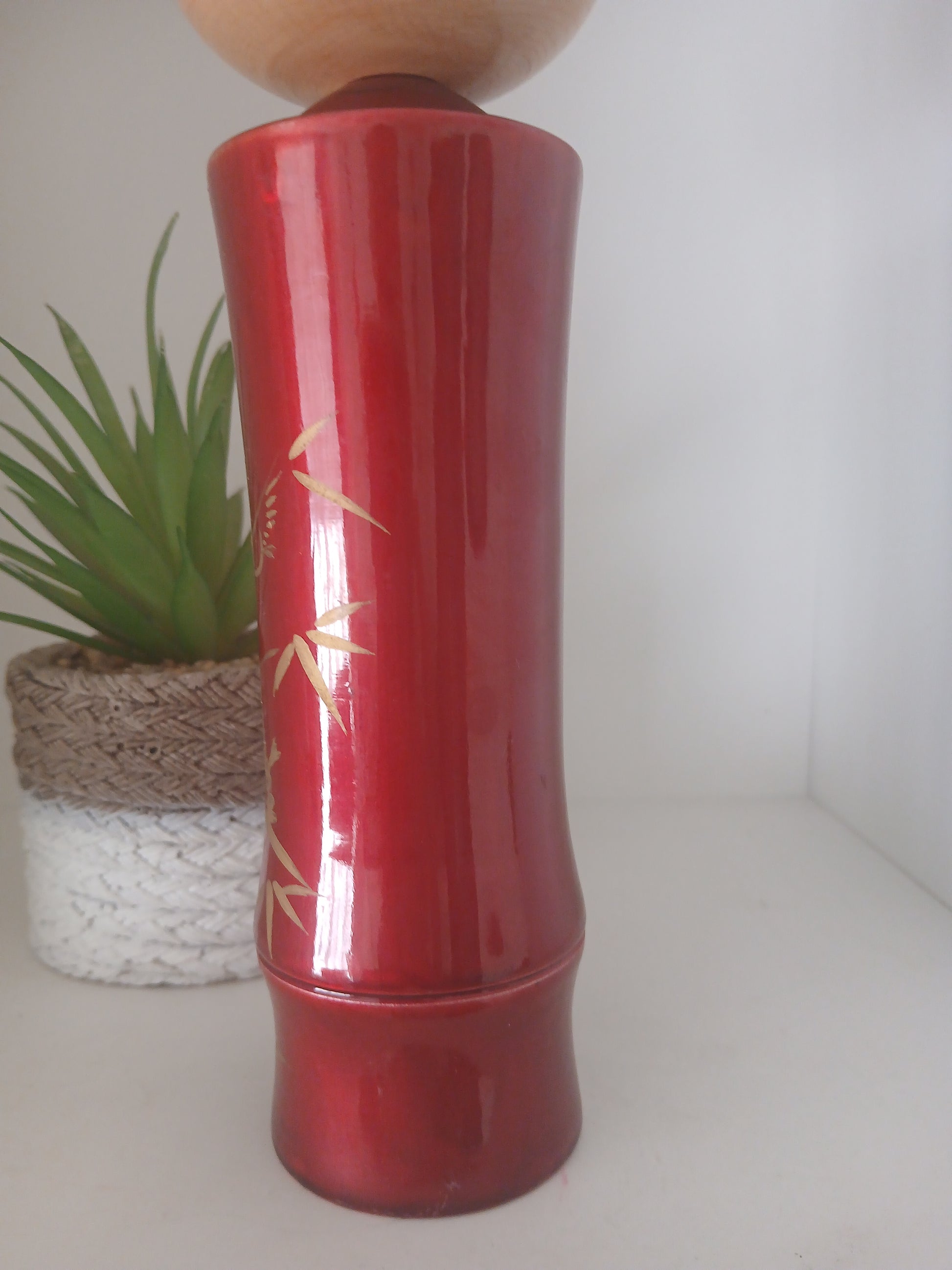 Lovely vintage red lacquer kokeshi by Takahashi Tatsuro, decorated with golden bamboe and 2 birds.
