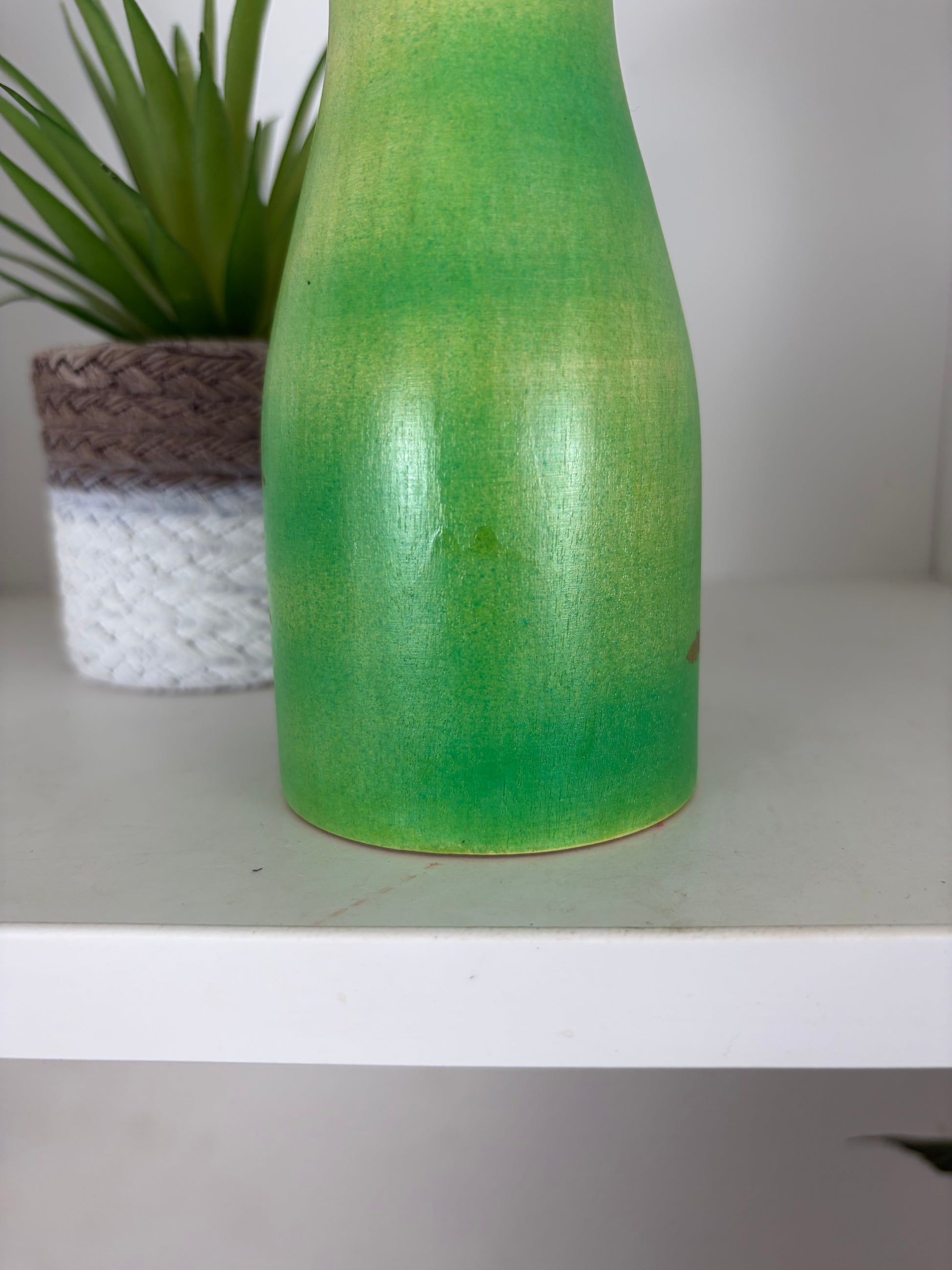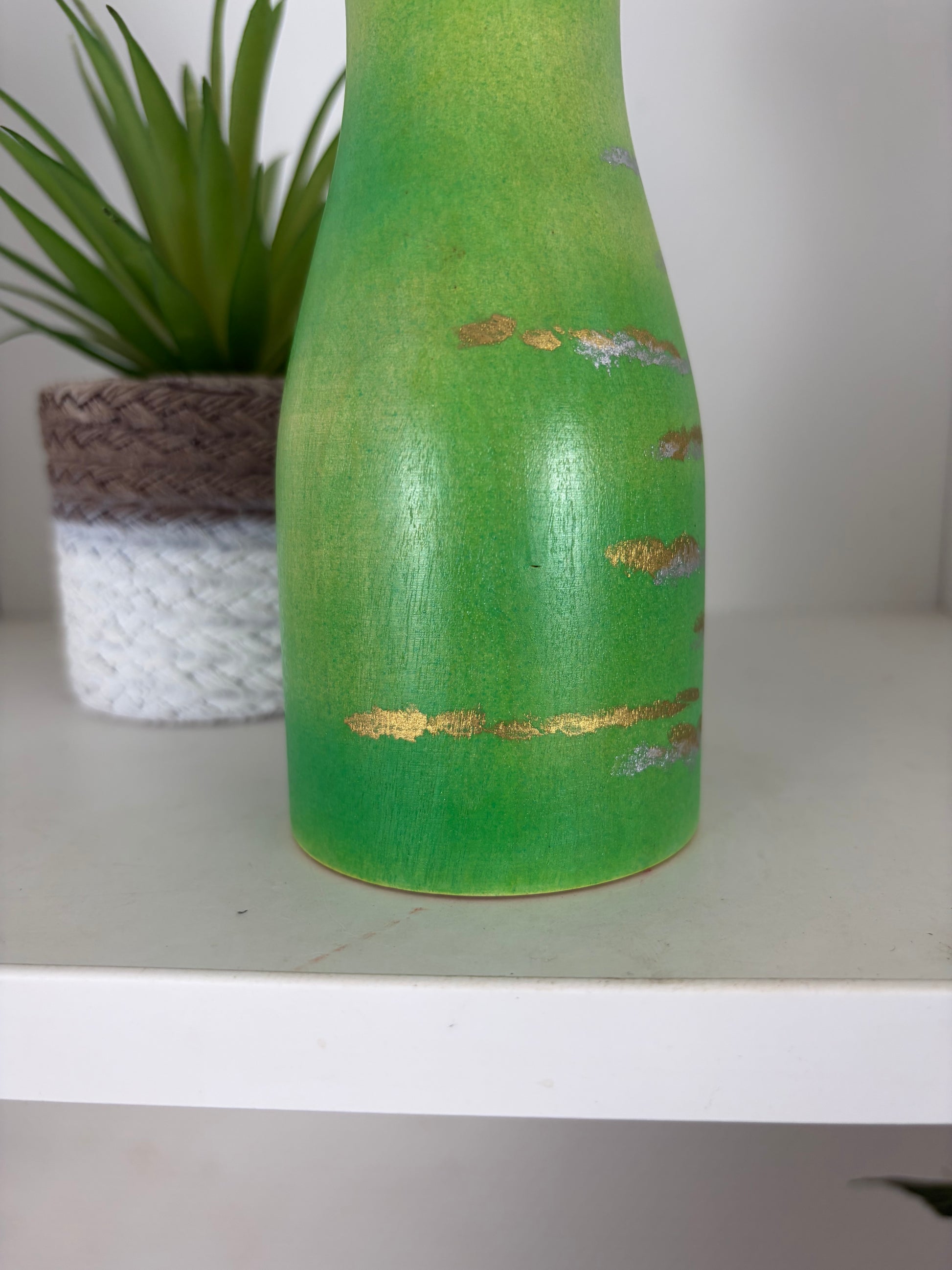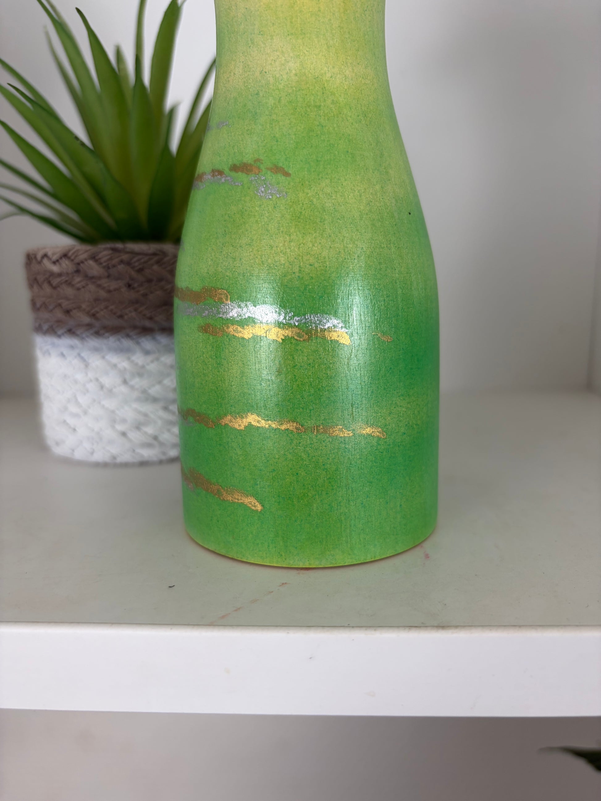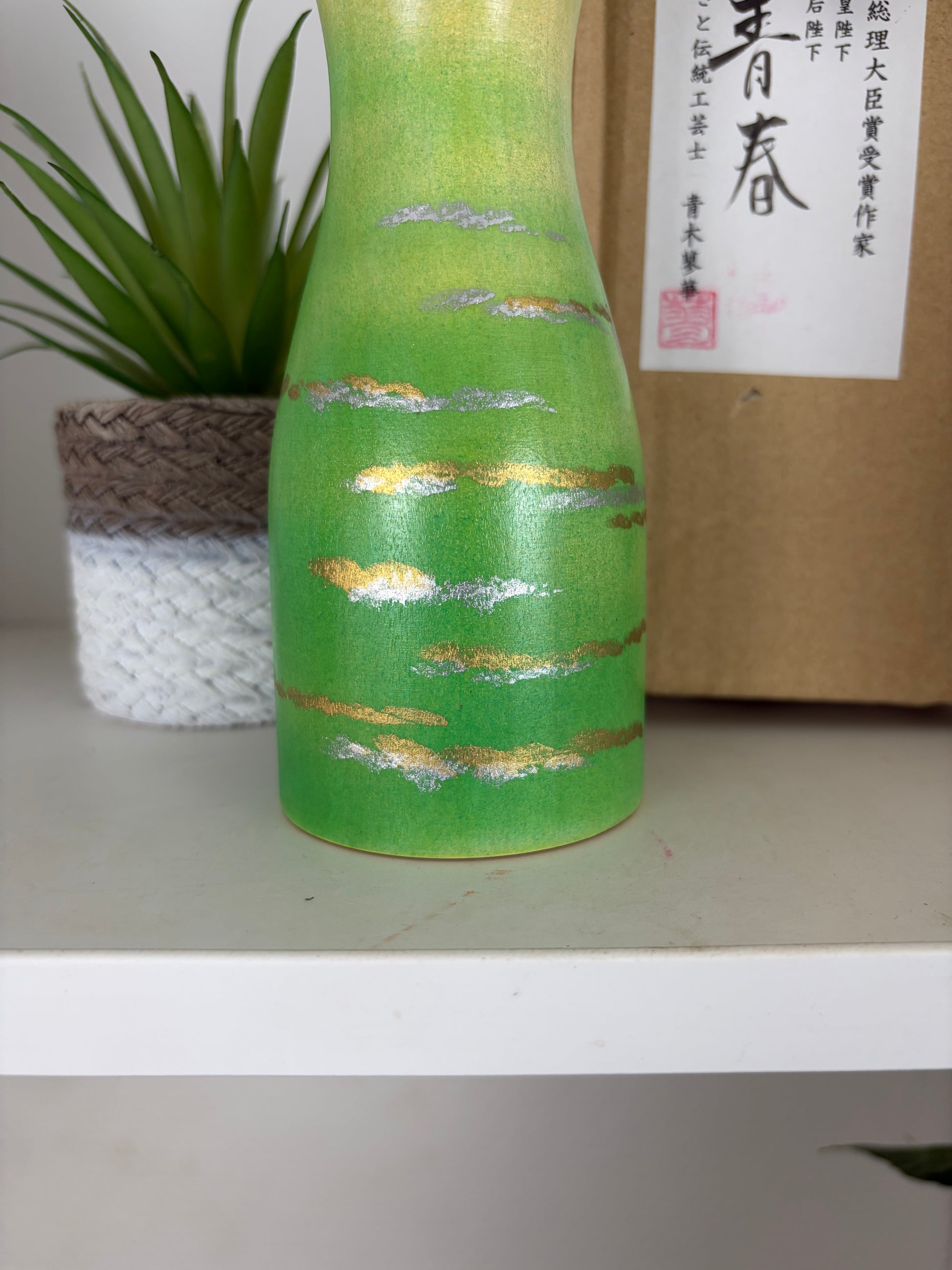 The elongated body is painted in layered shades of fresh green, accented with flowing horizontal bands of gold and silver that shimmer softly and suggest movement, light, or seasonal landscapes. The surface finish is smooth and luminous, highlighting the careful craftsmanship and painterly touch characteristic of Aoki Ryōka’s work.