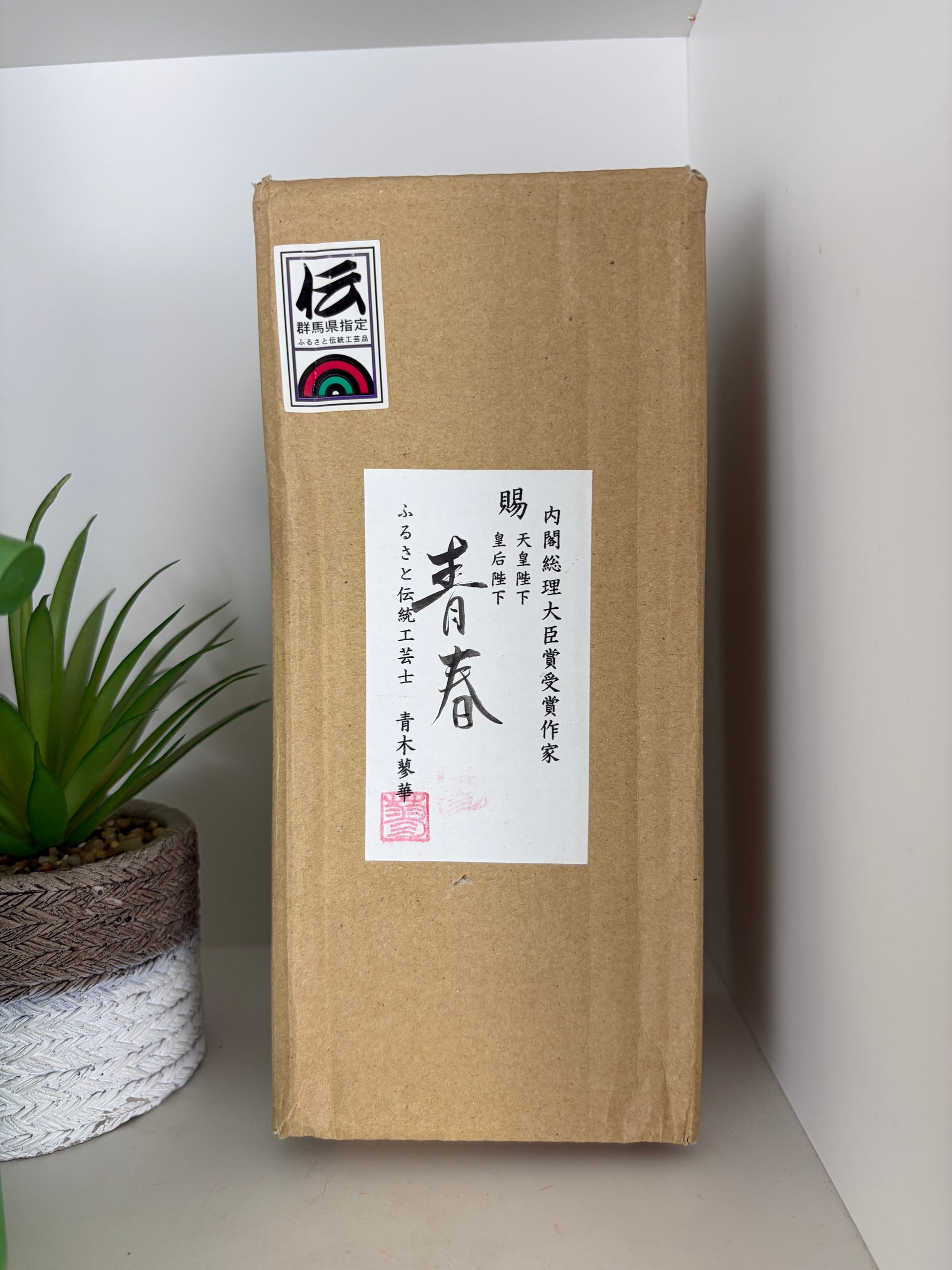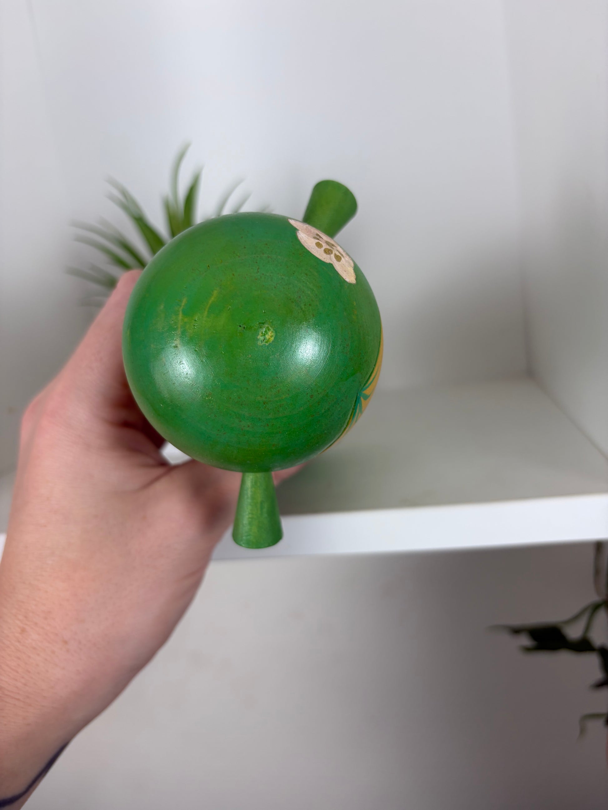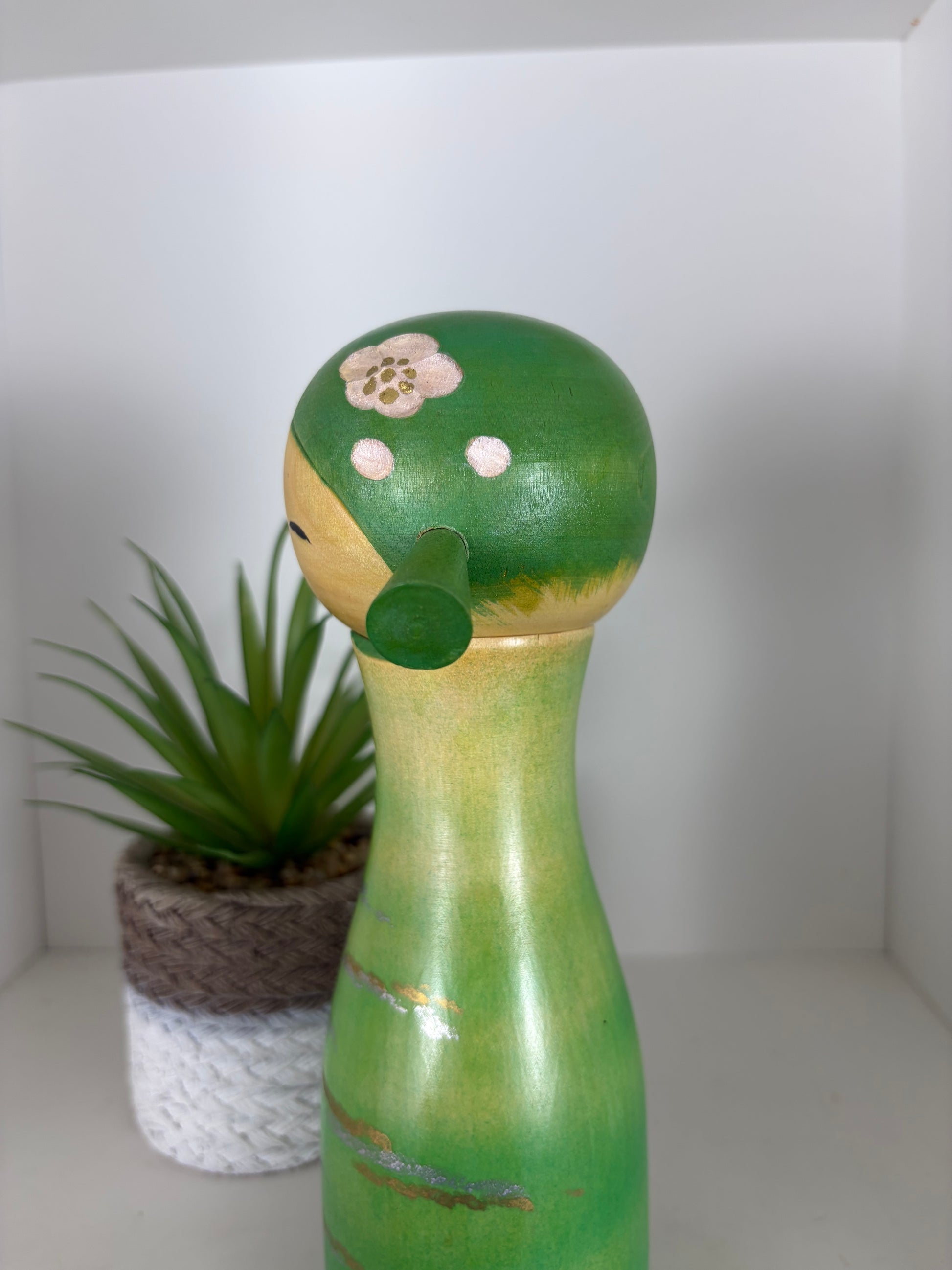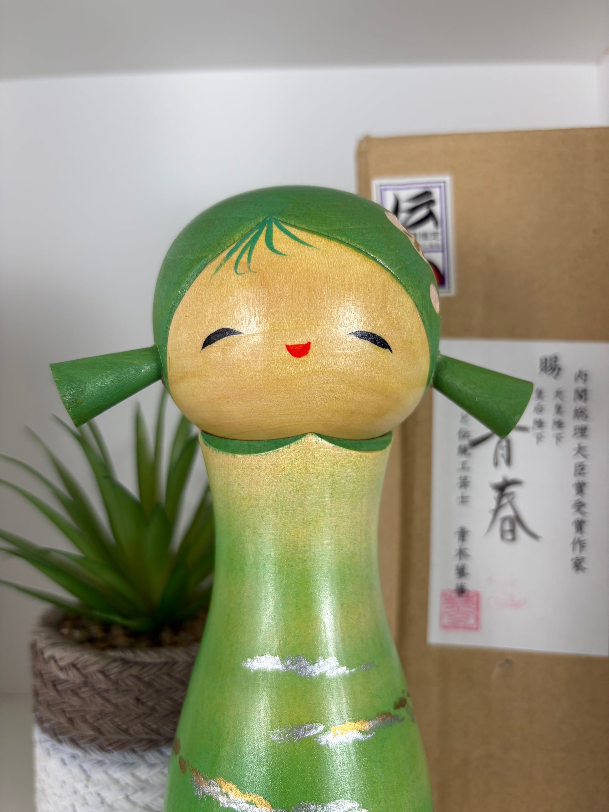 The overall impression is one of calm, elegance, and quiet joy. The doll balances simplicity and sophistication, making it both a charming decorative piece and a thoughtful example of modern Japanese folk art. It comes with its original box, underscoring its authenticity and value as a collectible work by a recognized kokeshi artist.