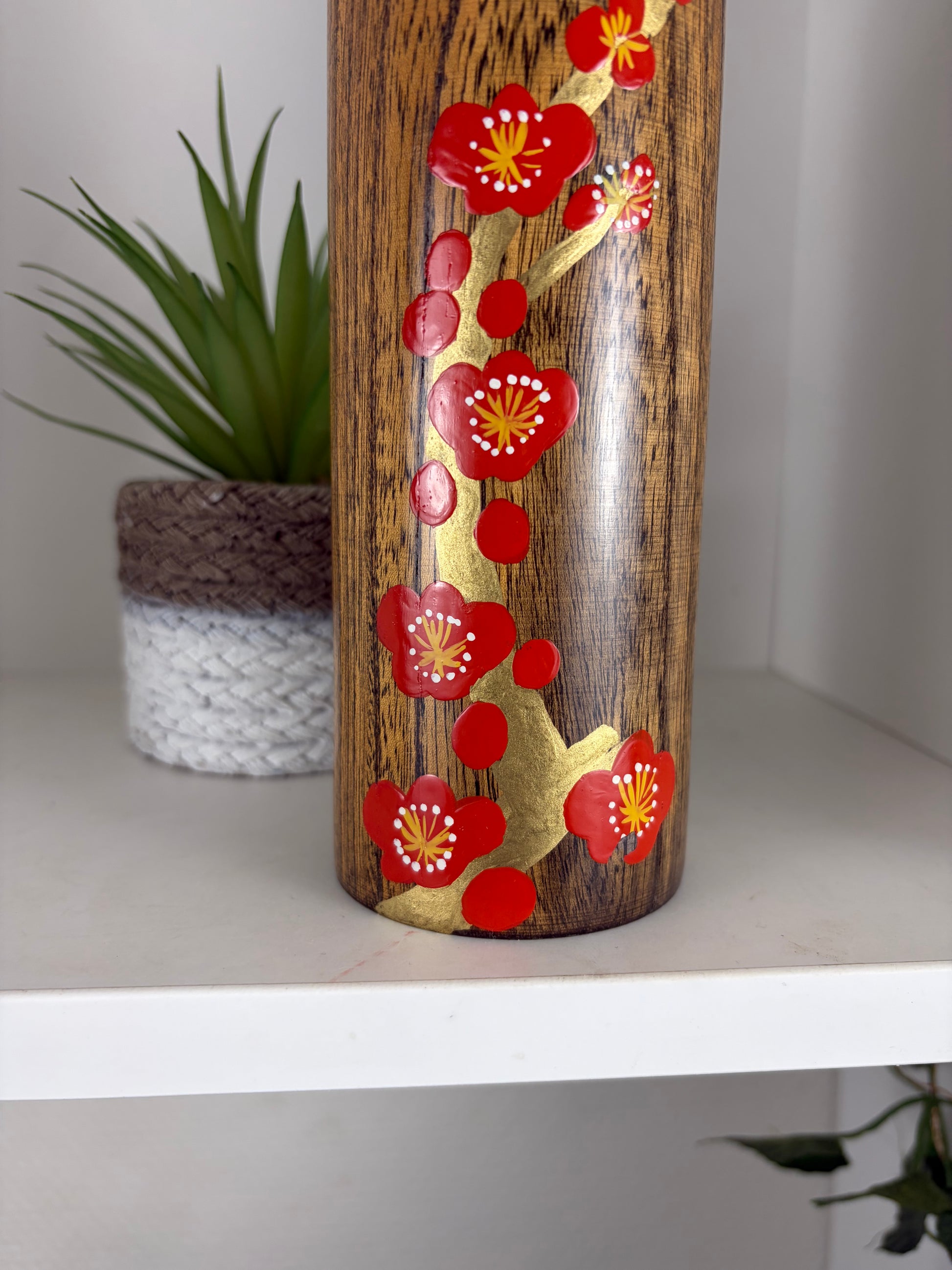 The body is beautifully decorated with a hand-painted branch of red plum blossoms (ume), accented with touches of gold. The blossoms stand out vividly against the darkened wood grain, symbolizing renewal, resilience, and the arrival of spring in Japanese culture. The flowing composition follows the vertical form of the doll, enhancing its sense of balance and harmony.