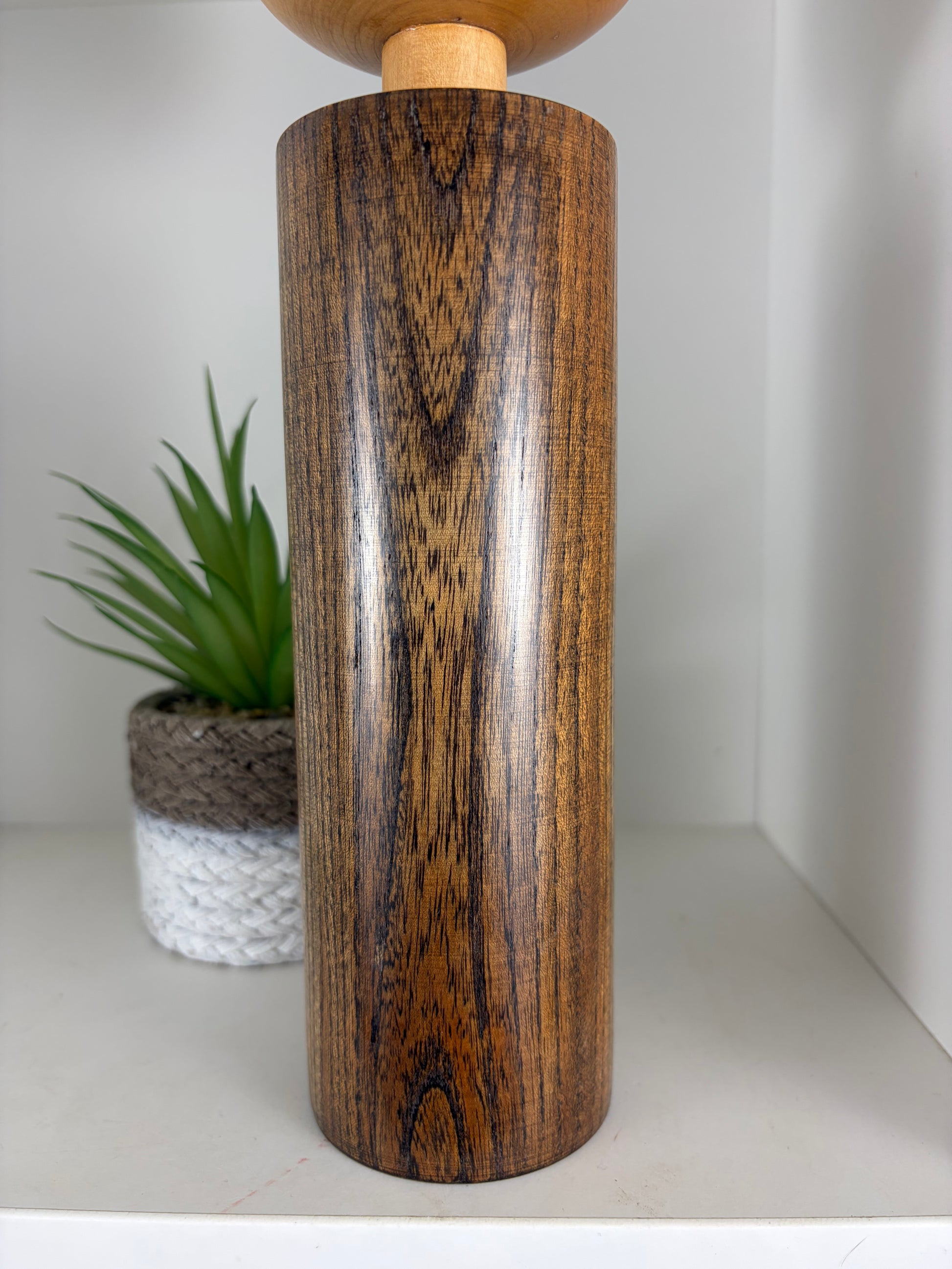 This elegant kokeshi doll is a refined example of the work of Takahashi Hashime, a respected Japanese kokeshi artist known for his emphasis on natural wood grain and restrained, poetic decoration. The doll features a tall, cylindrical body topped with a softly rounded head, creating a calm and dignified silhouette.