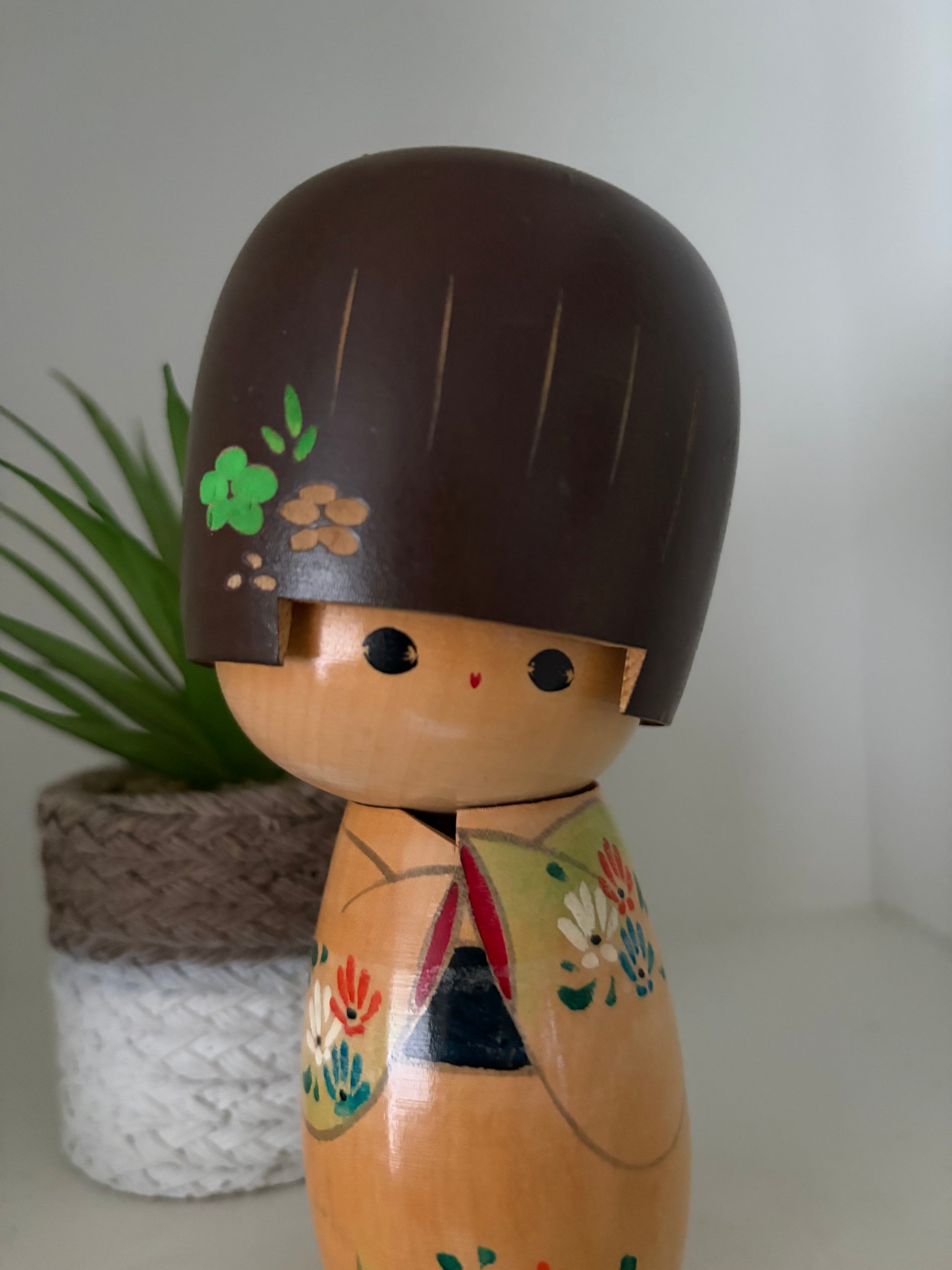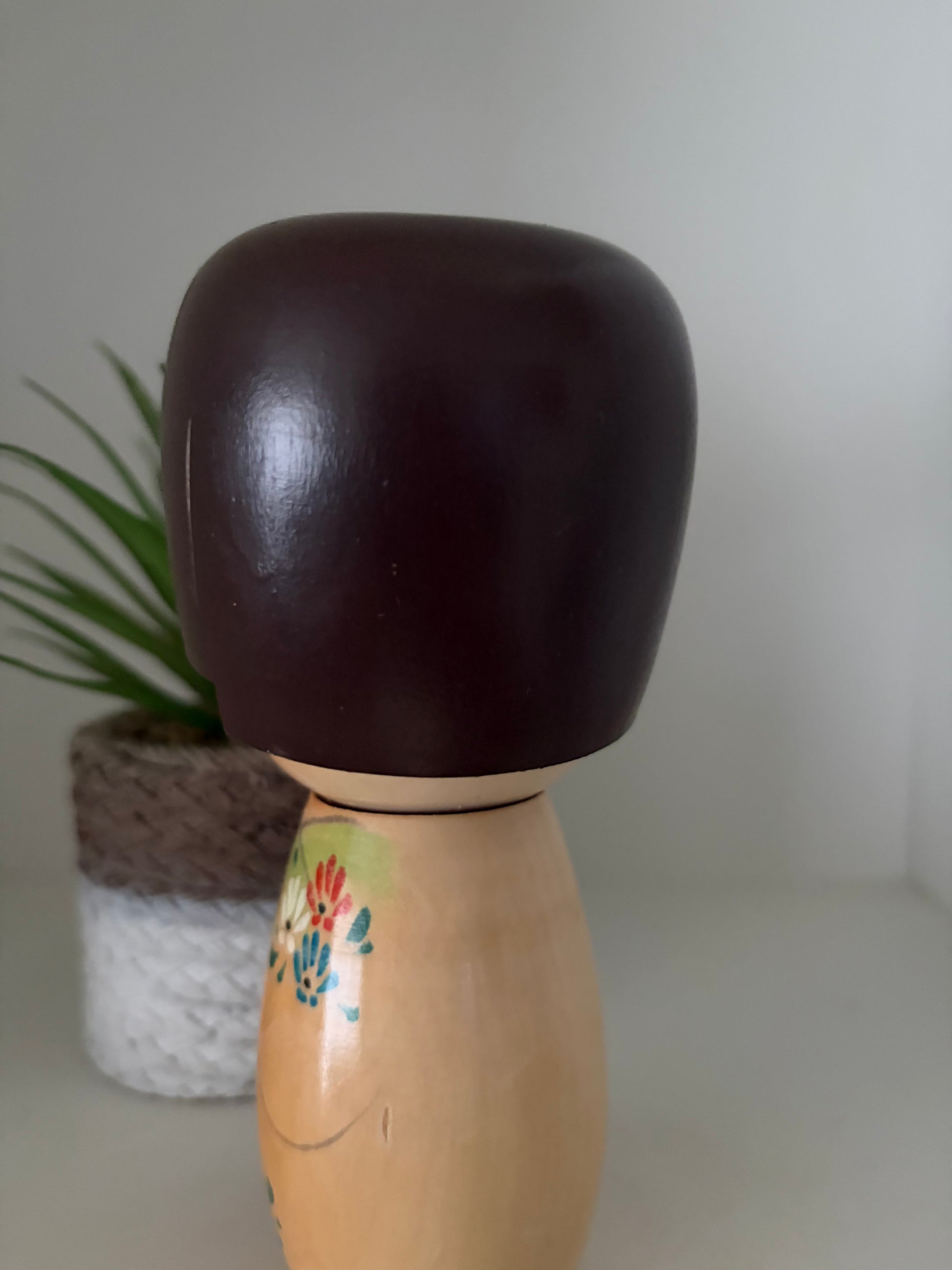 This is a traditional Japanese wooden kokeshi doll. It features a simple cylindrical body and a large, dark hairstyle decorated with subtle floral details. The kimono is hand-painted in warm tones with colorful flower patterns. The face is minimalist, with small eyes and a tiny red mouth, giving the doll a calm and charming appearance.