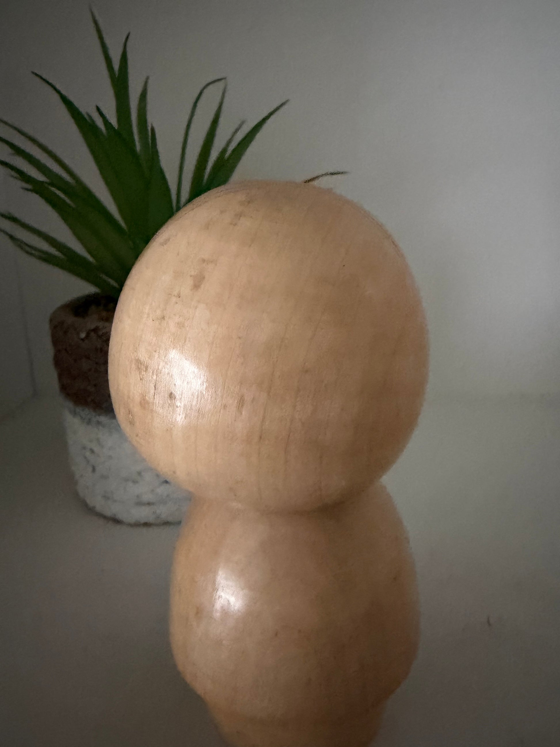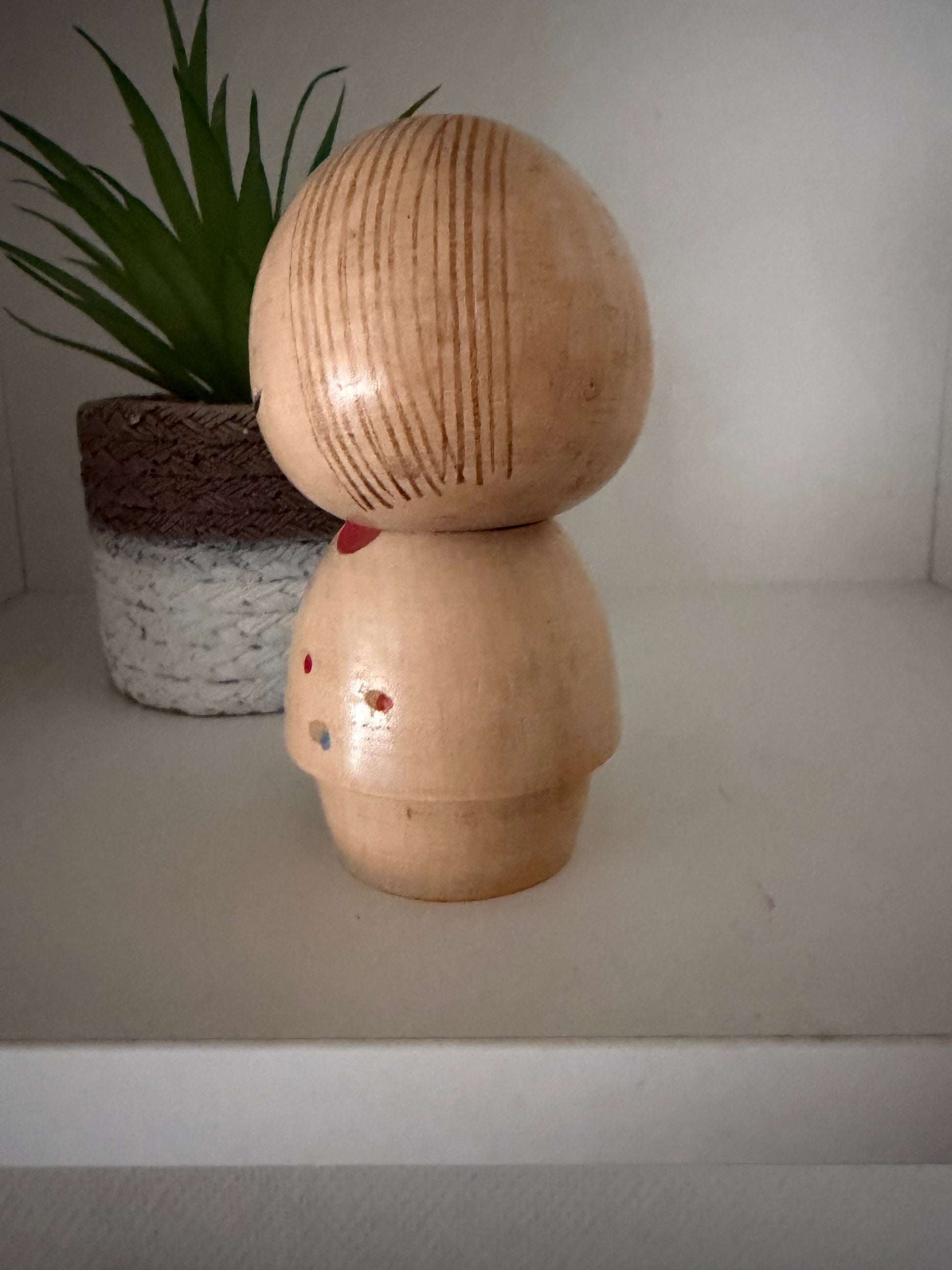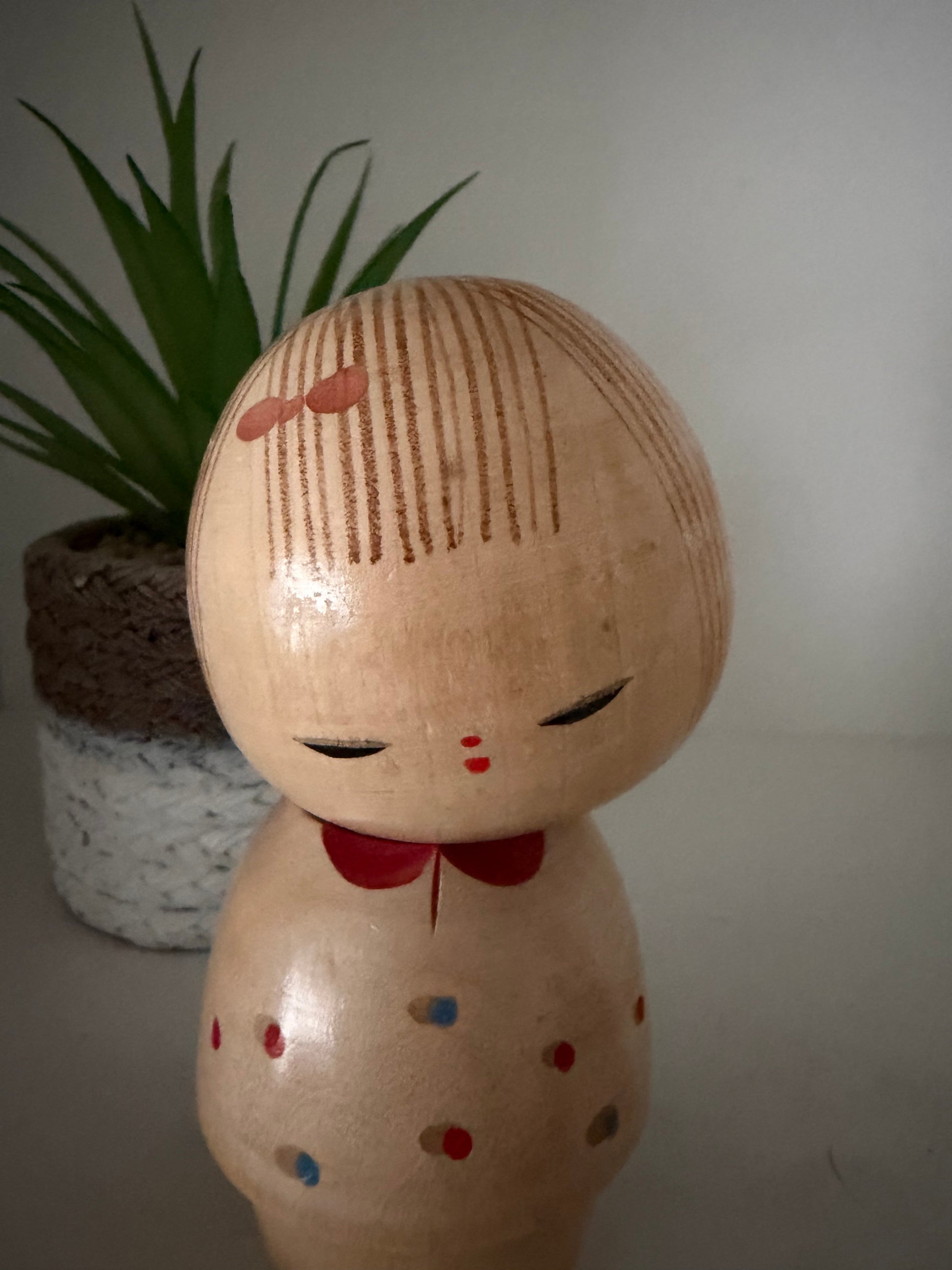 Cute vintage Sosaku kokeshi, she as a cute little red ribbon and the kimono is simply decorated wit red and blue dots.