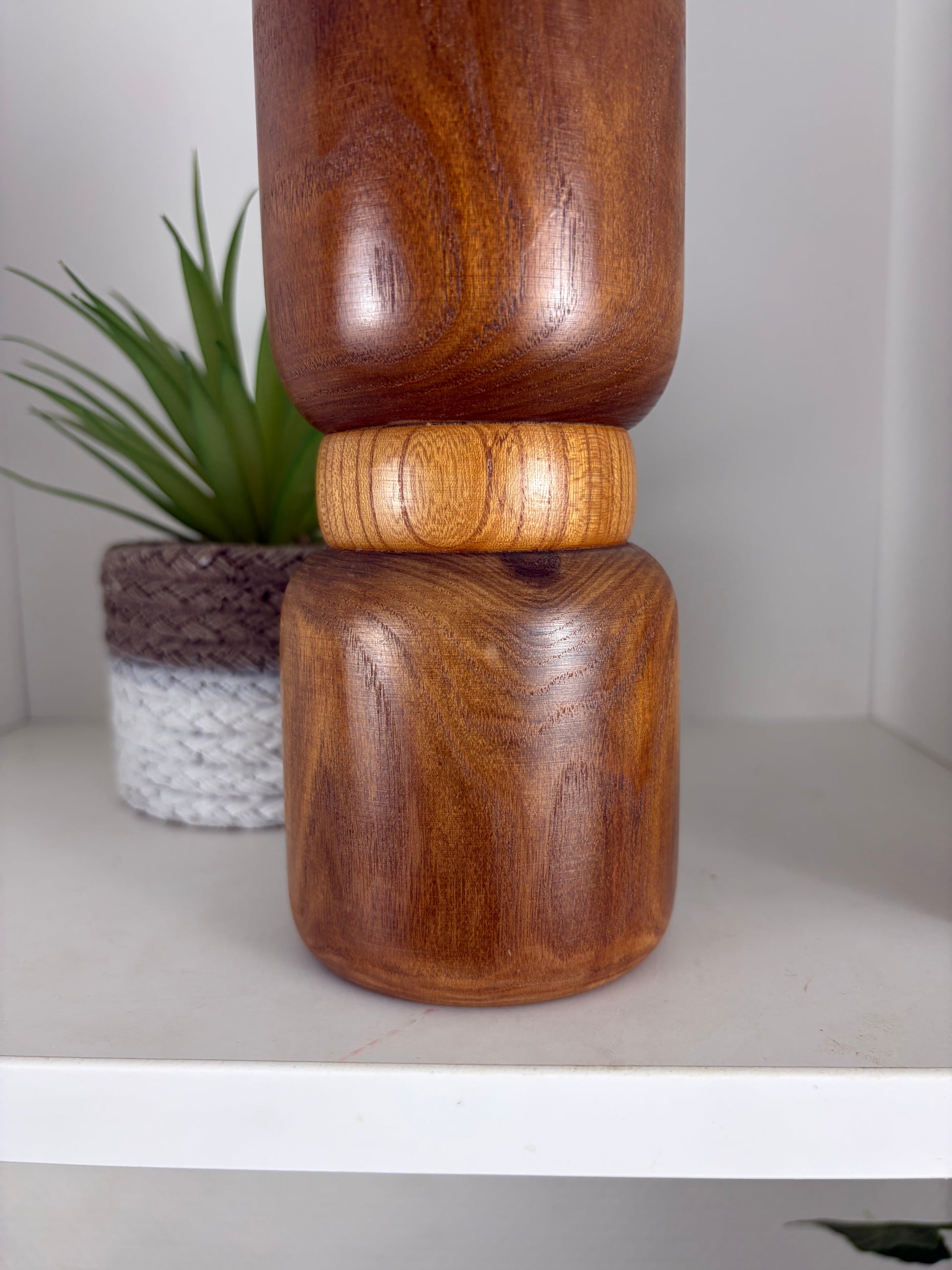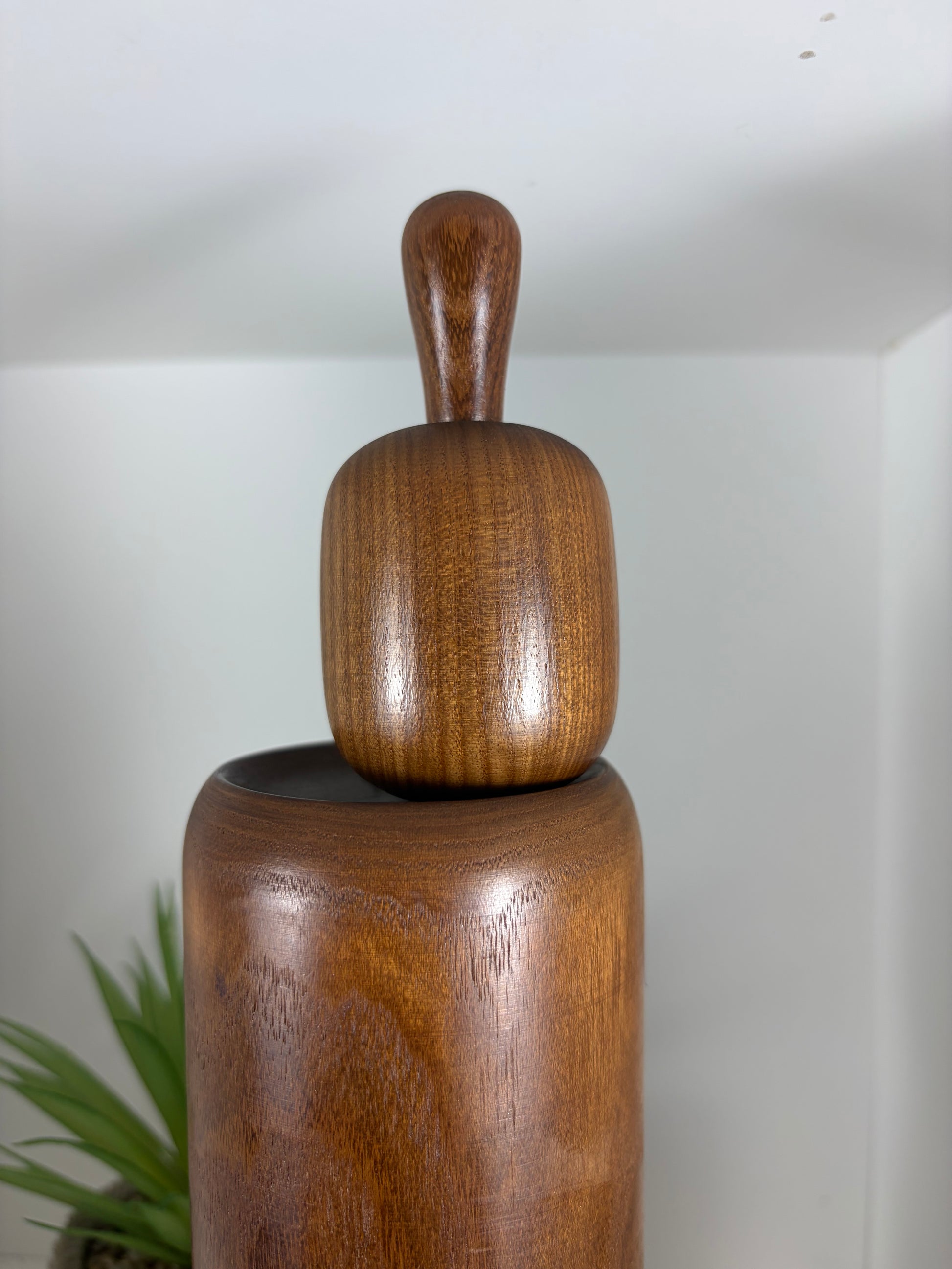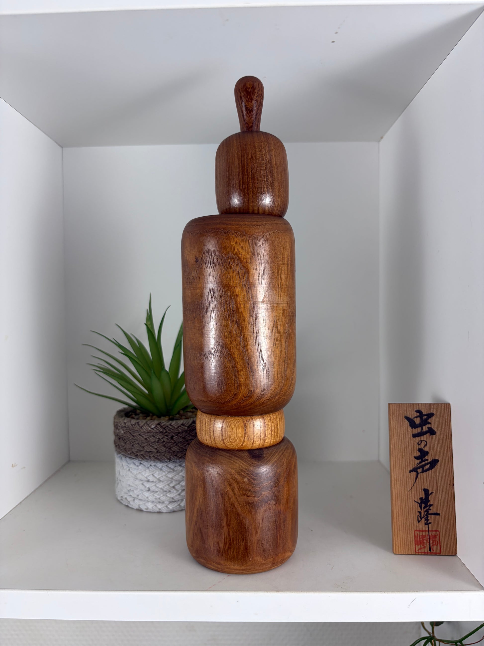 The doll is carved from solid wood. It features a tall, cylindrical body and a small, rounded head with a simple, serene facial expression, characteristic of classic kokeshi aesthetics. The head is topped with a smooth, rounded handle-like knob, a distinctive design element often associated with master craftsmen.
