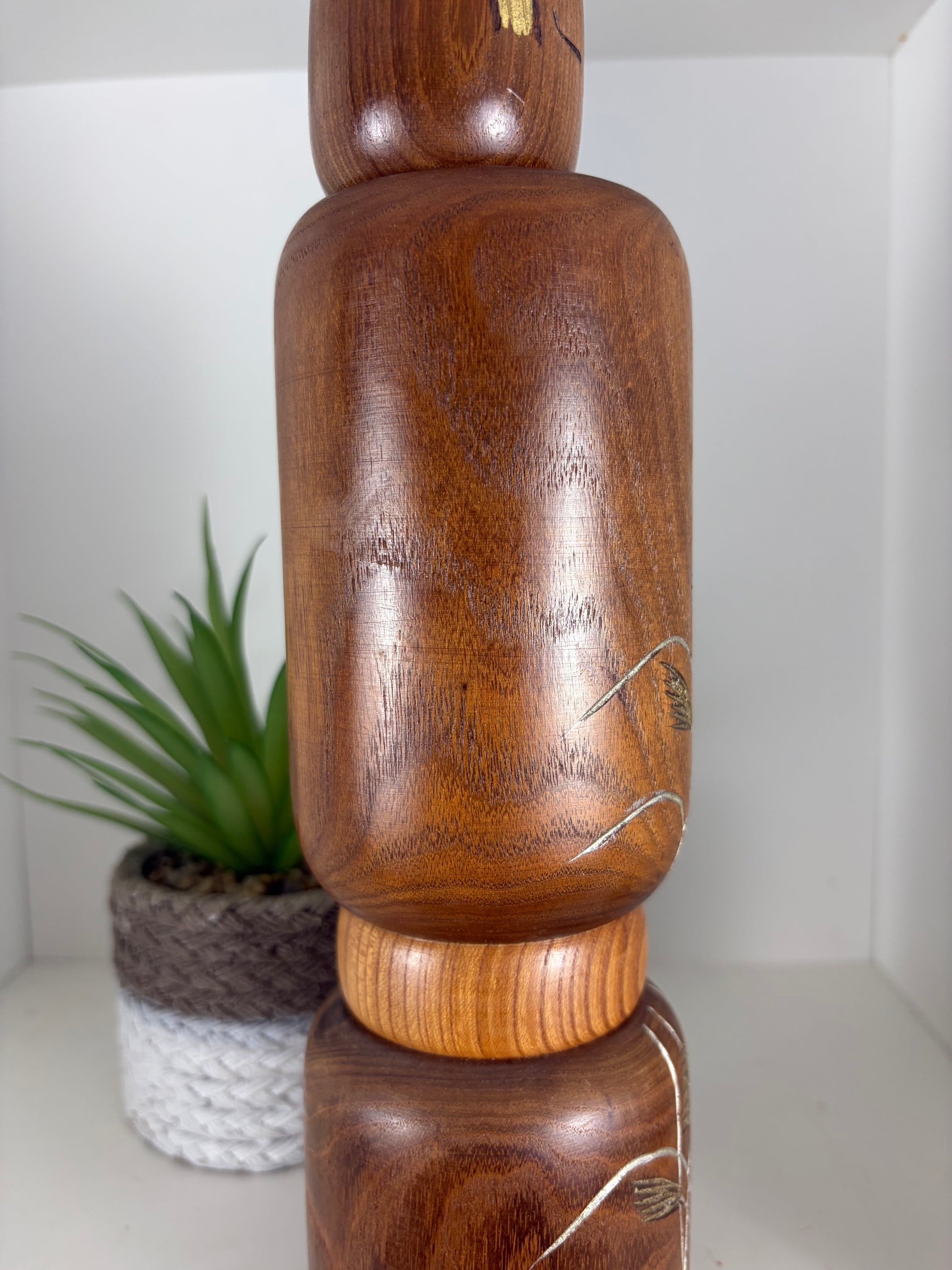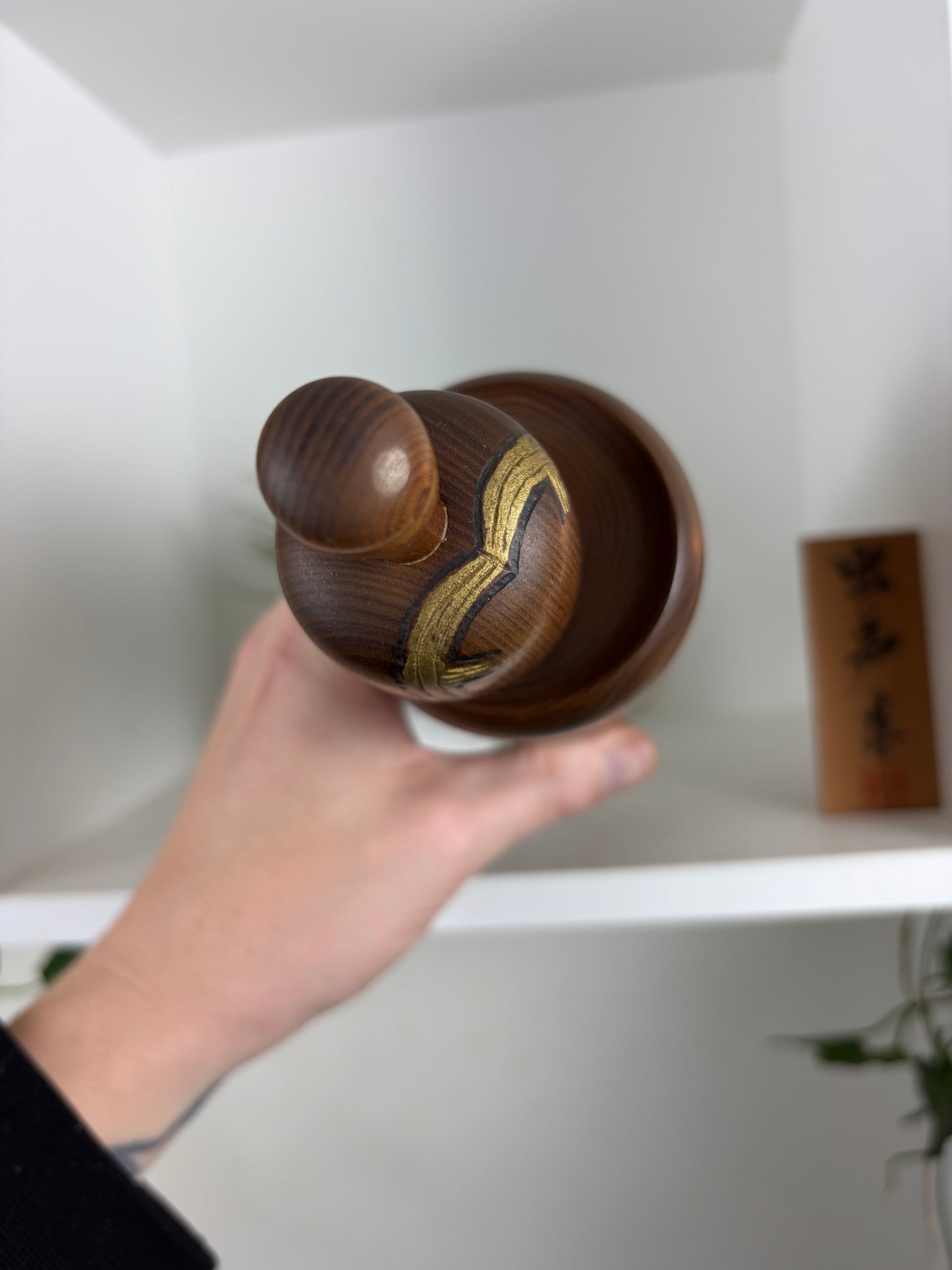 This is a finely crafted traditional Japanese kokeshi doll by Aida Seiho, an accomplished woodturner known for refined forms and elegant surface decoration.