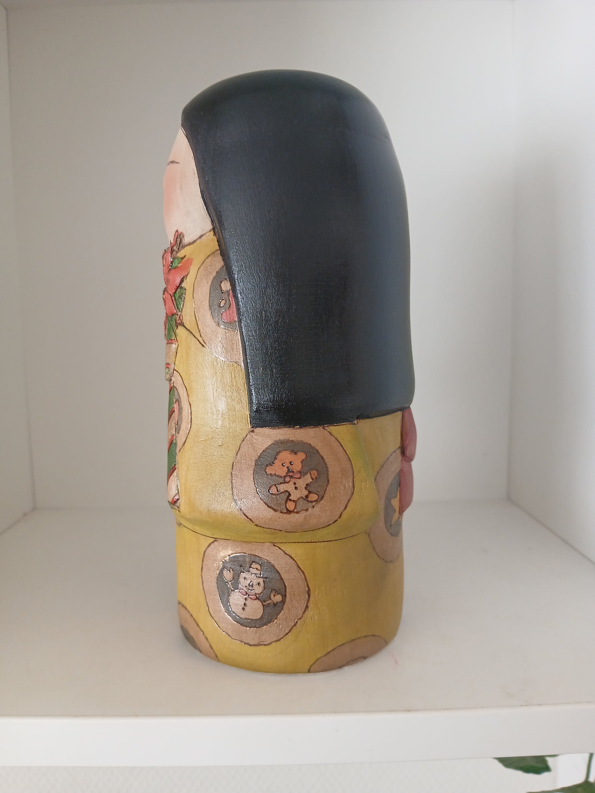 This kokeshi is part of the Christmas serie from Yuko Yamazaki for Kokeshiparadise, with a total of 8 pieces in the serie. All one of a kind pieces!