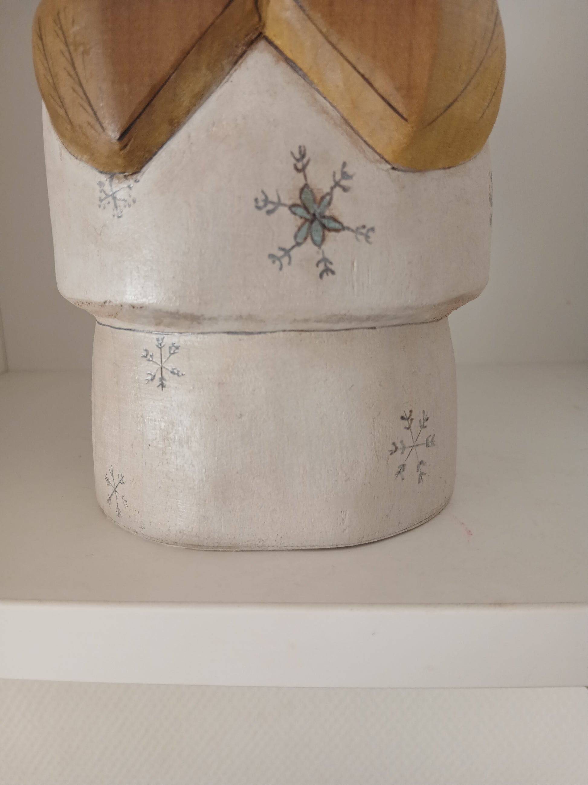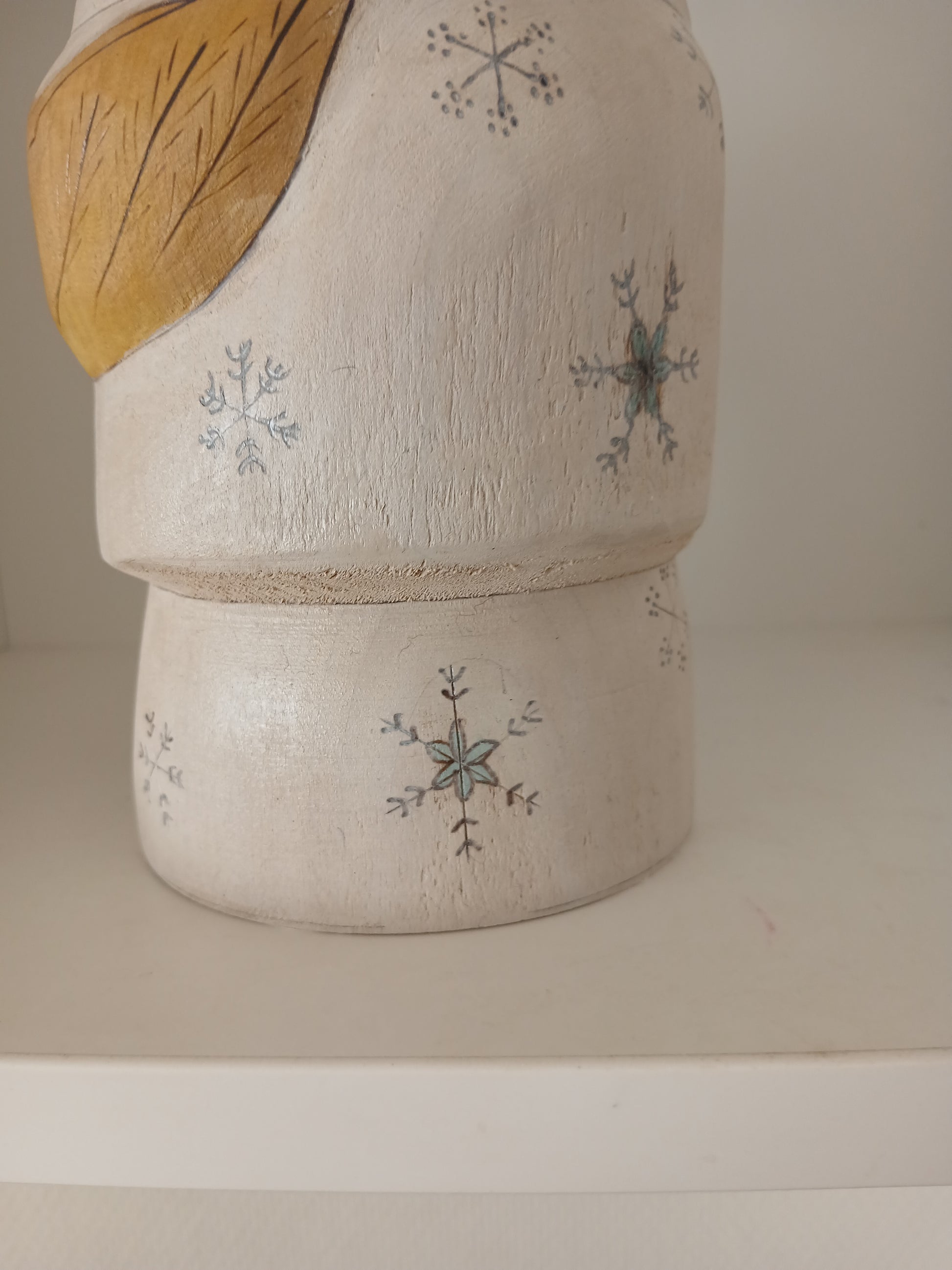 On the back, the doll features beautifully carved angel wings in natural wood tones. These wings soften the silhouette and emphasize the celestial theme suggested by the title Angel Boy. The snowflake motifs continue around the figure, giving the entire piece a harmonious and detailed finish.