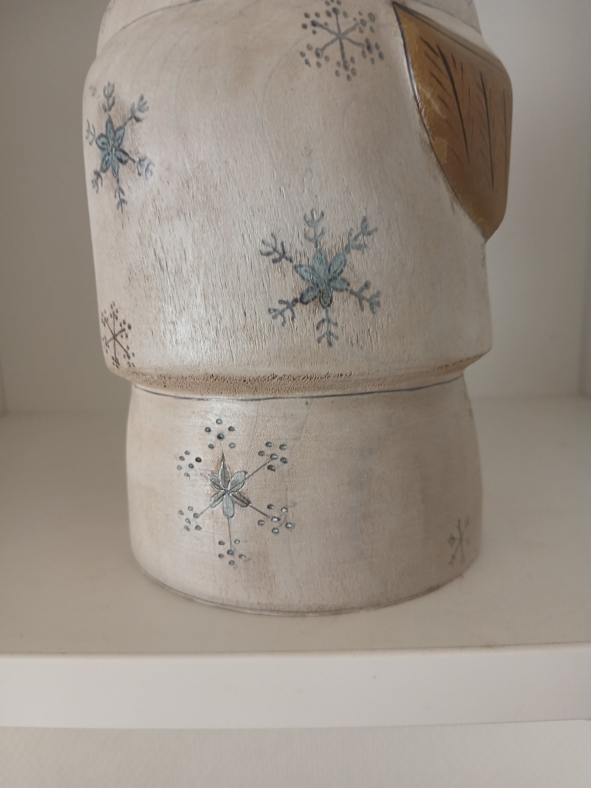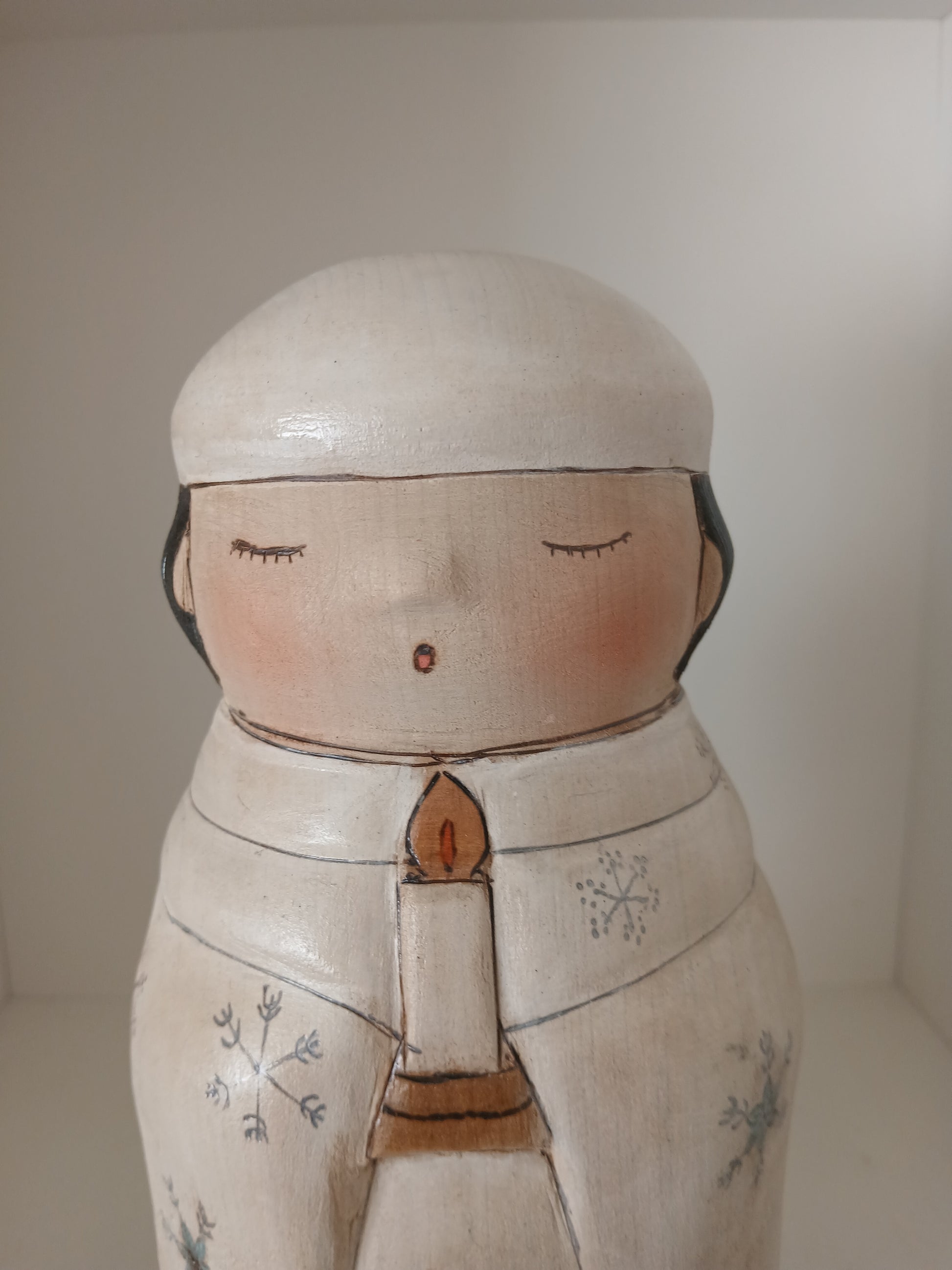 The kimono is decorated with delicate hand-painted snowflakes in subtle hues of blue and grey, creating a calm and wintry atmosphere. In his hands, the angelic figure holds a lit candle, carefully carved and painted in warm, glowing tones—symbolizing light, hope, and comfort during the dark winter months.