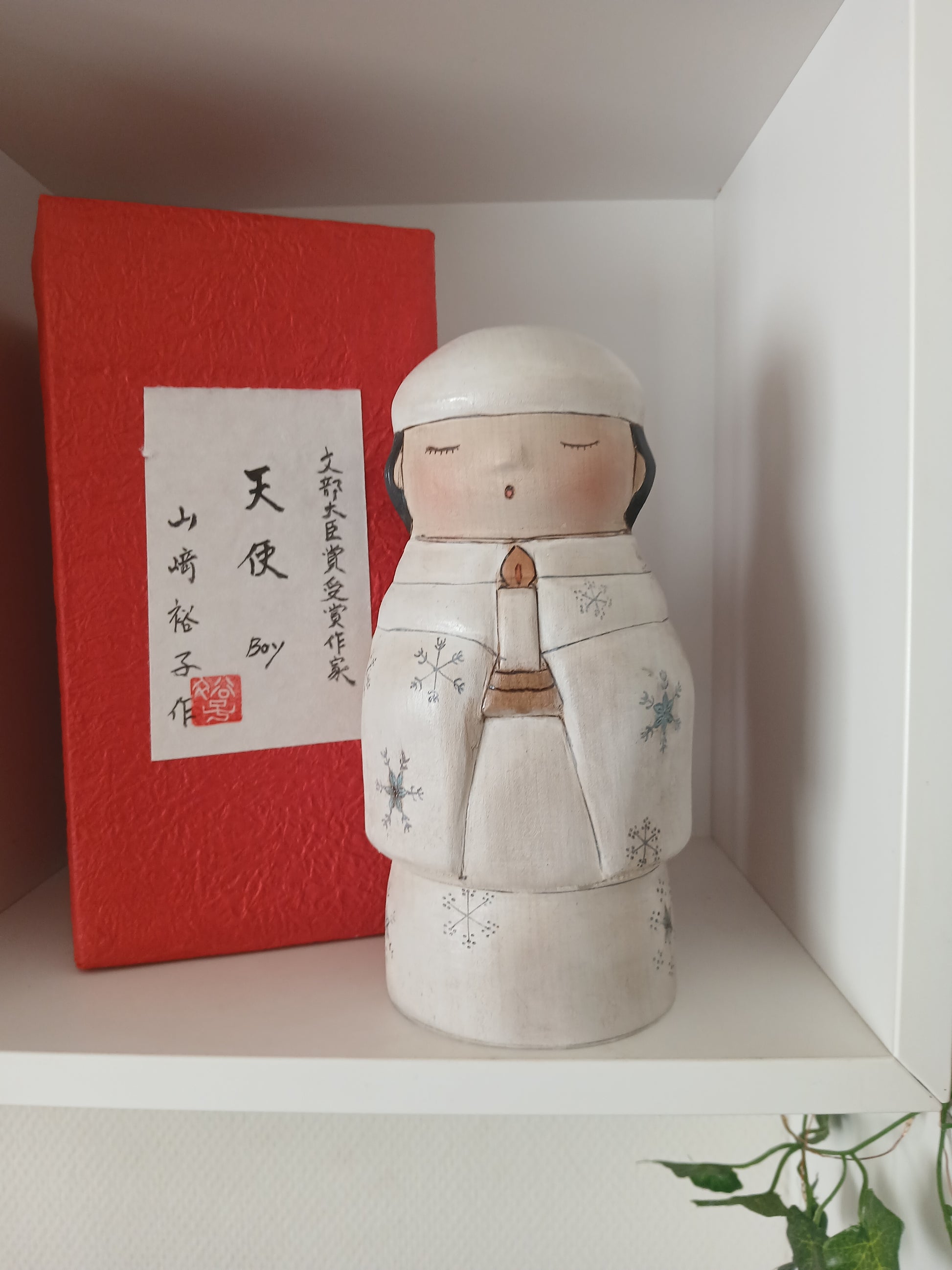 This unique kokeshi doll by Yuko Yamazaki, titled Angel Boy, is part of her enchanting Christmas series and beautifully captures the gentle spirit of the winter season.