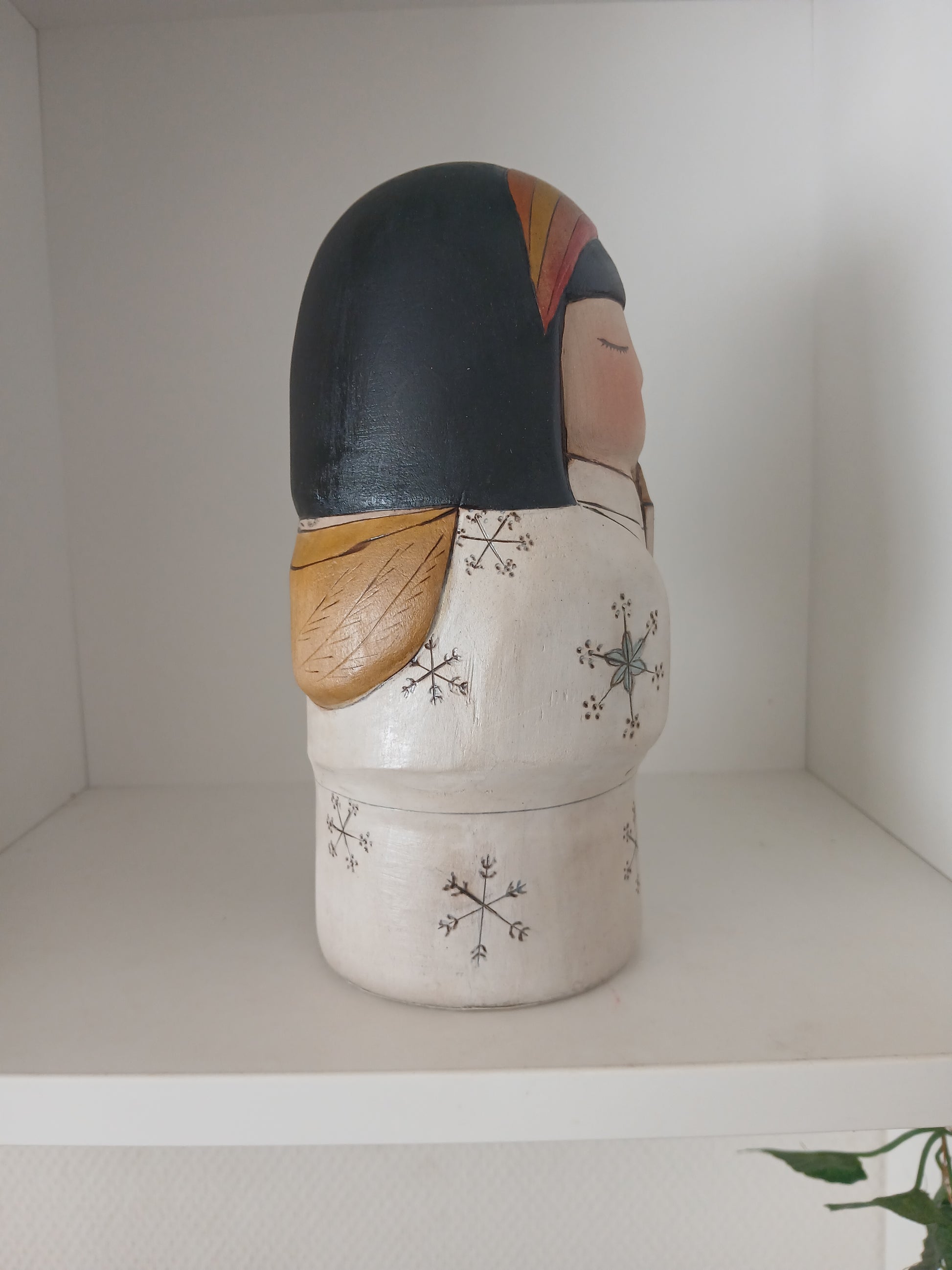 This kokeshi is part of the Christmas serie from Yuko Yamazaki for Kokeshiparadise, with a total of 8 pieces in the serie. All one of a kind pieces!
