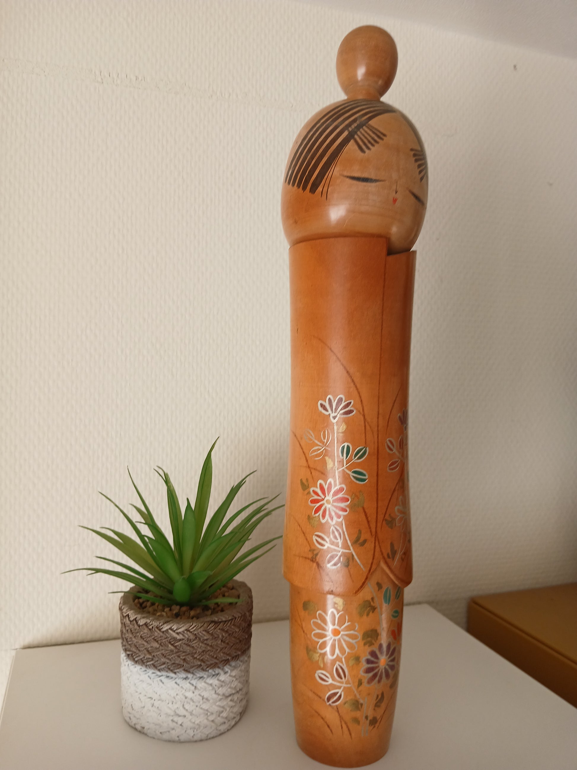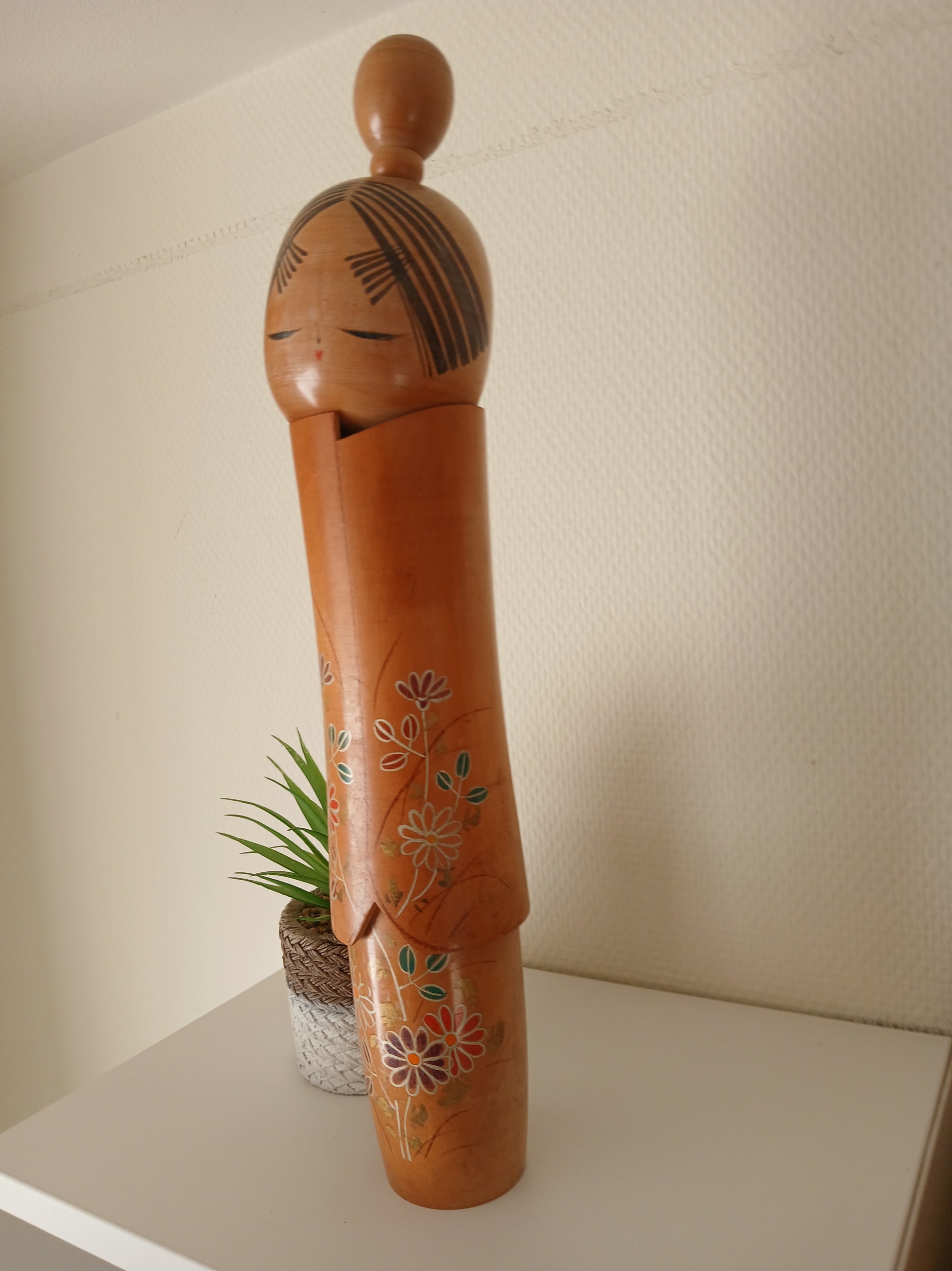 Exclusive Big Sosaku kokeshi by Sato Suigai. Decorated with colorful Chrysanthemums.