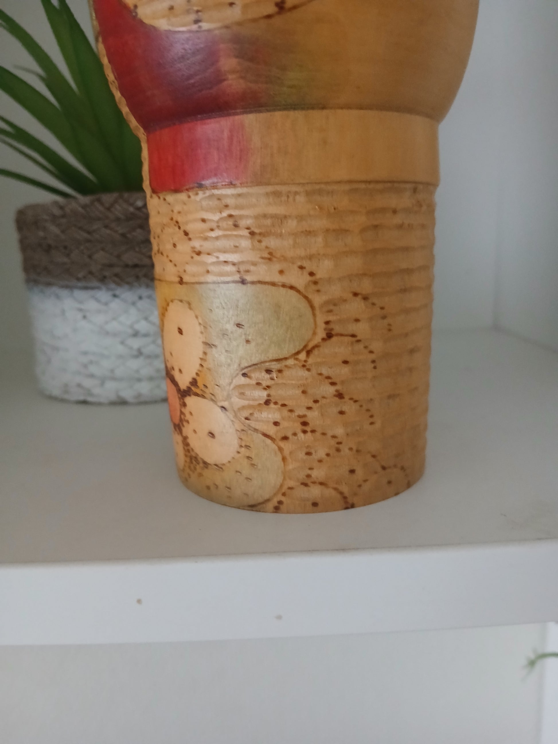 Exclusive sosaku kokeshi By Akimitsu. A real piece of art with amazing engraving technics and  with a very colorful kimono!