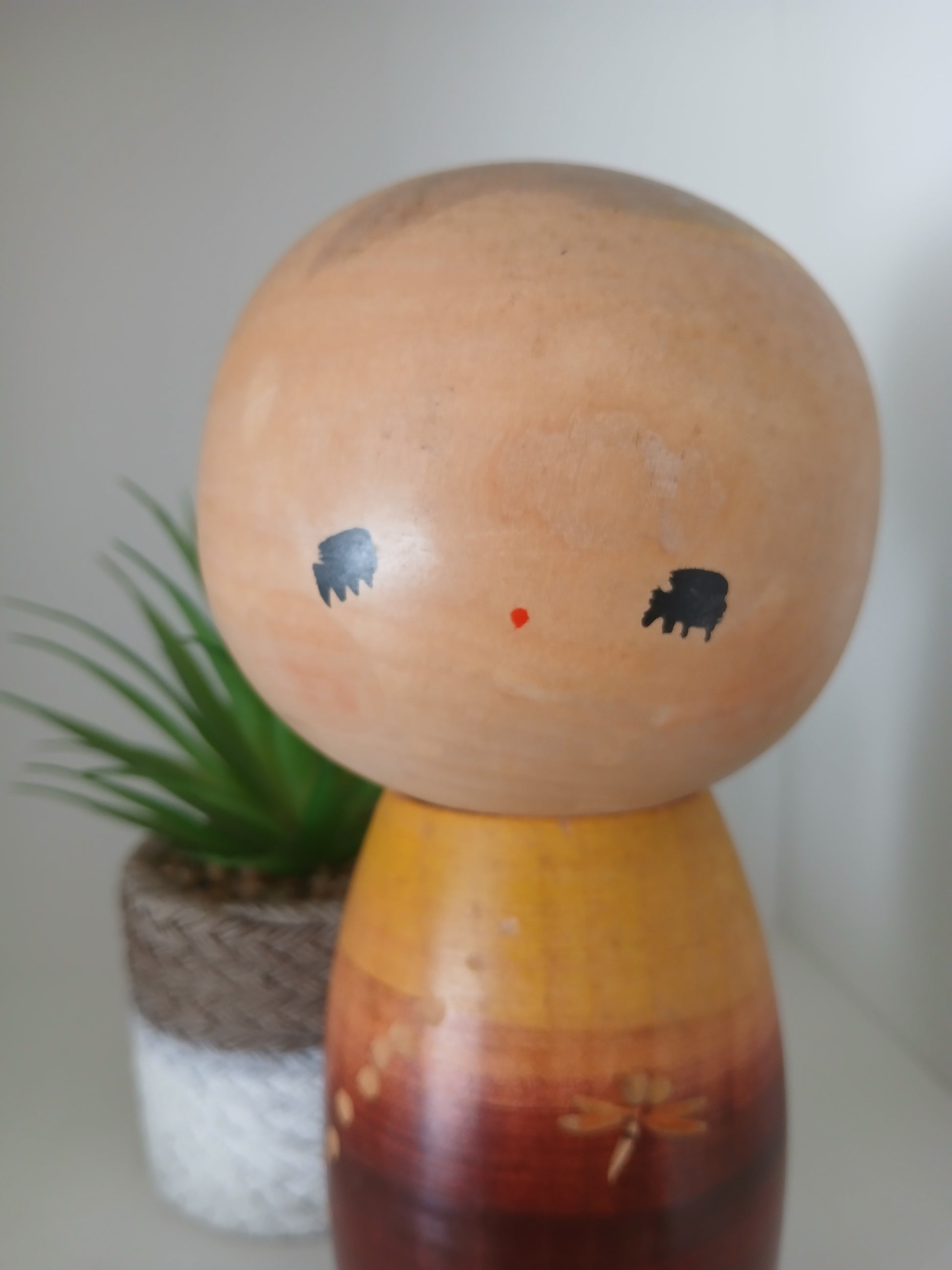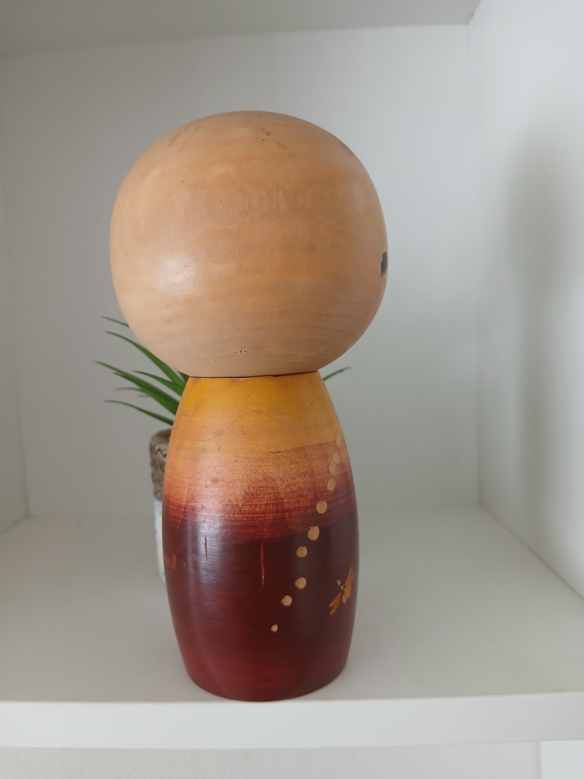Bring a touch of Japanese elegance into your home with this beautiful, hand-painted kokeshi doll. With her simple round head and minimalist facial expression, she exudes peace and serenity. The body is richly colored in warm red and brown tones and decorated with delicate motifs of flowers and dragonflies – an ode to Japanese nature and seasons.