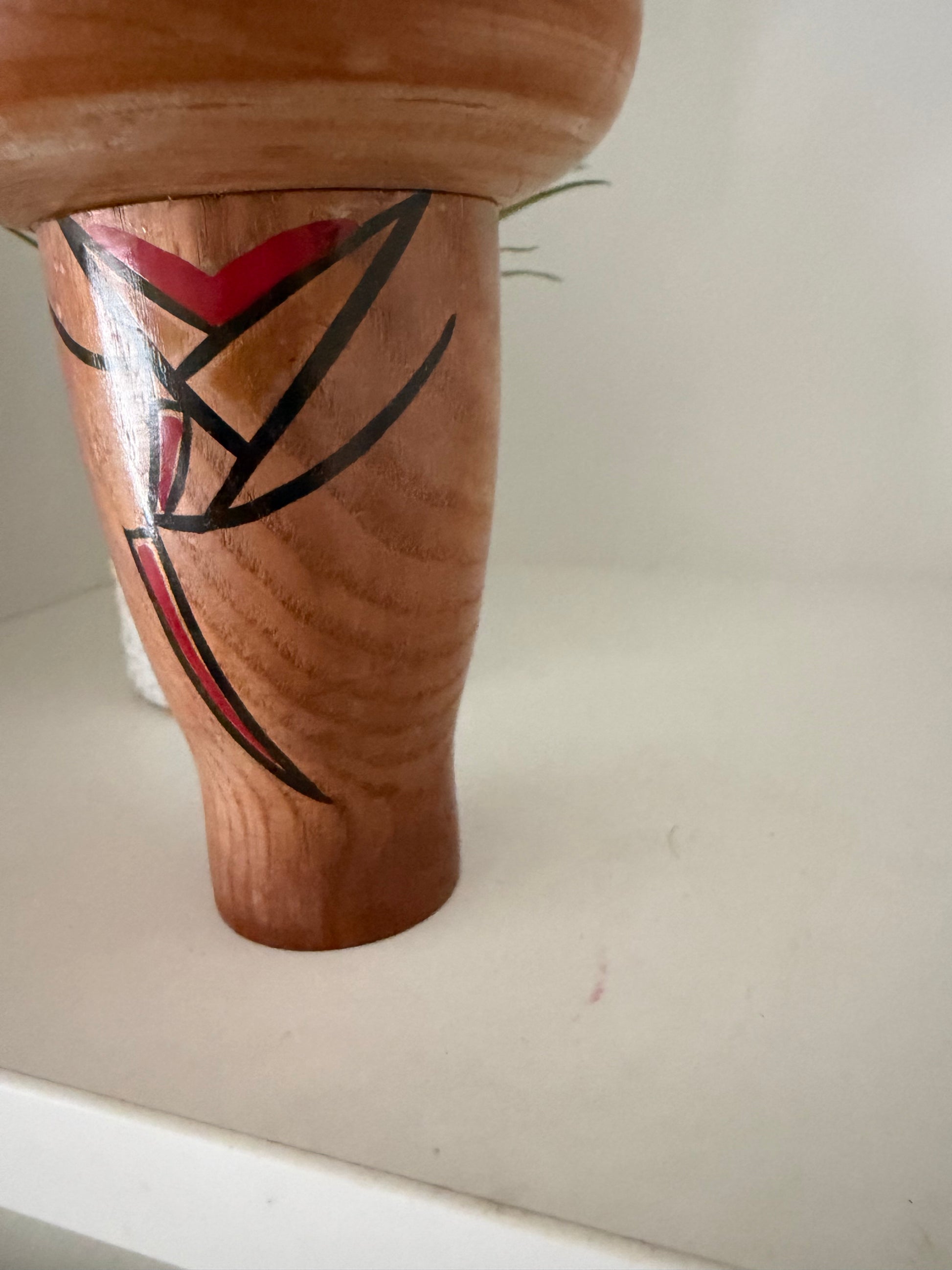 The slender body is decorated with bold, hand-painted abstract kIlona in black and red forming dynamic, flowing lines that contrast beautifully with the natural wood surface. These modern graphic elements are characteristic of Ishida Kanji’s creative approach, blending traditional kokeshi craftsmanship with a contemporary, artistic sensibility.