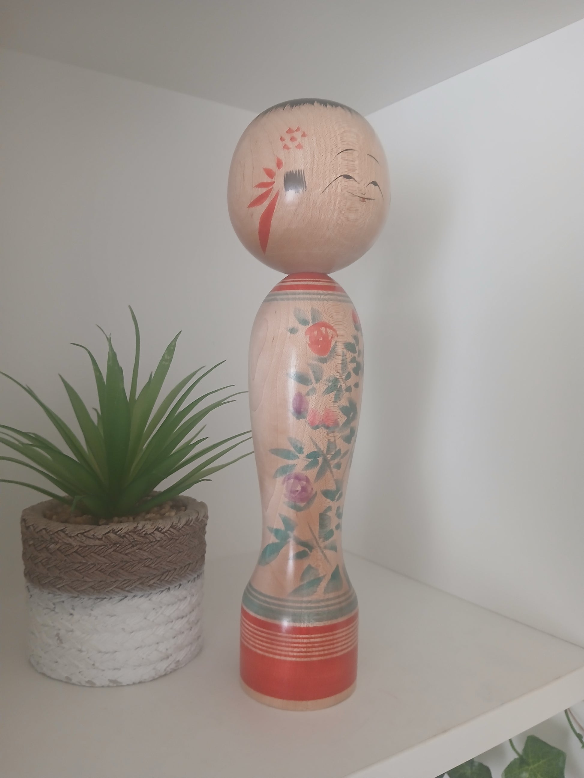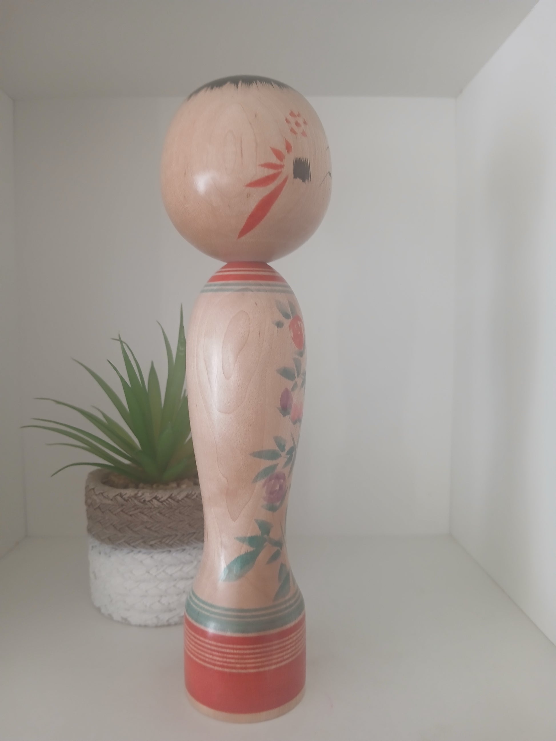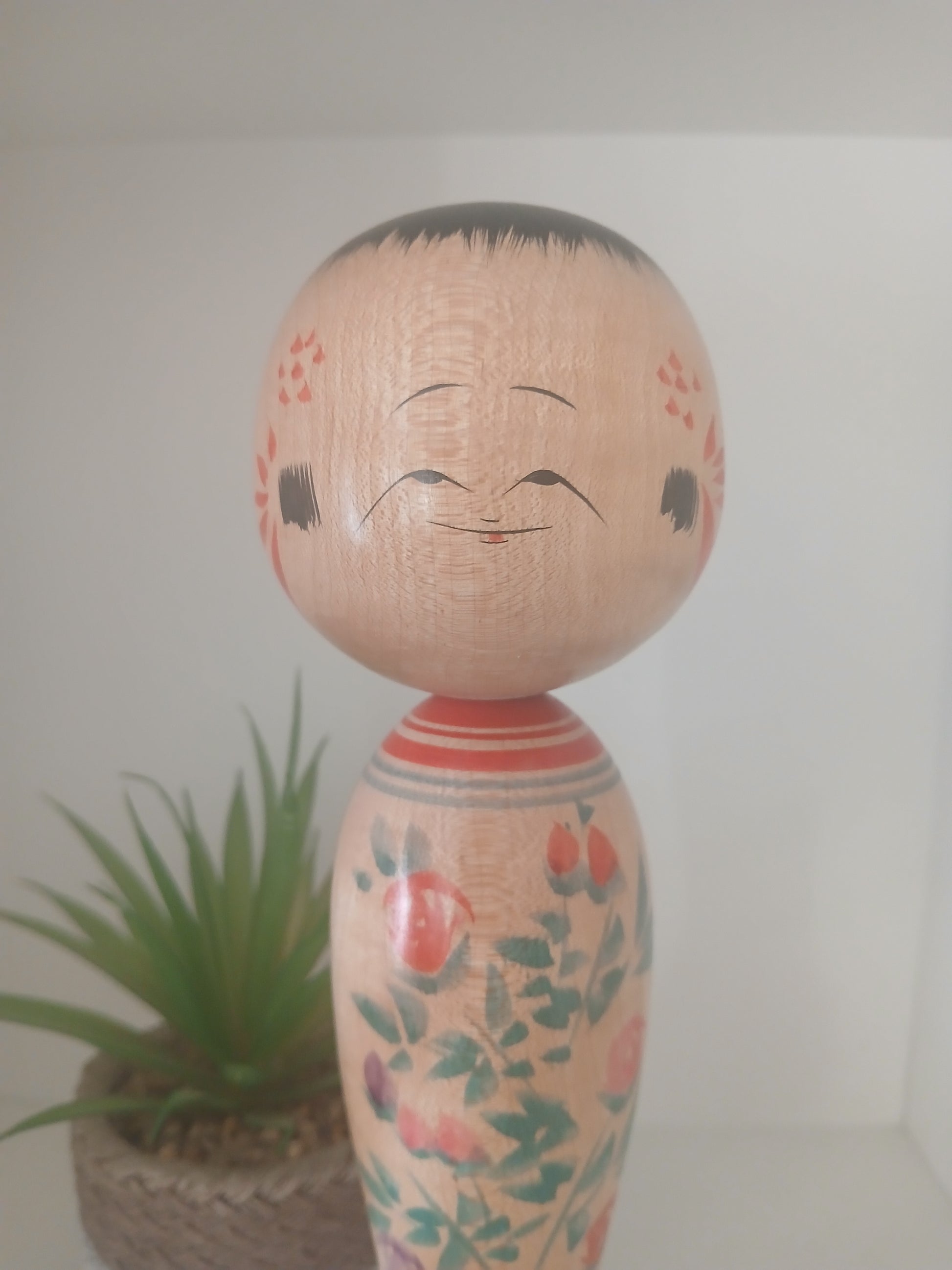 Each region imparts its own distinct style to the shapes and facial features of its kokeshi, and this Zao-style doll is no exception. Carved from soft, white birch (kabanoki) and entirely hand-painted, it is an unusually elaborate example of the craft. The doll features the classic oversized head and expressive eyes, along with bold, decorative brushstrokes across the front of its kimono. Red roses (akaibara) symbolize passion, while purple (murasaki) represents admiration. A traditional rokoru moyo pattern forms horizontal red and green bands around the neck and shoulders, complemented by varying red stripes near the base of the figure.