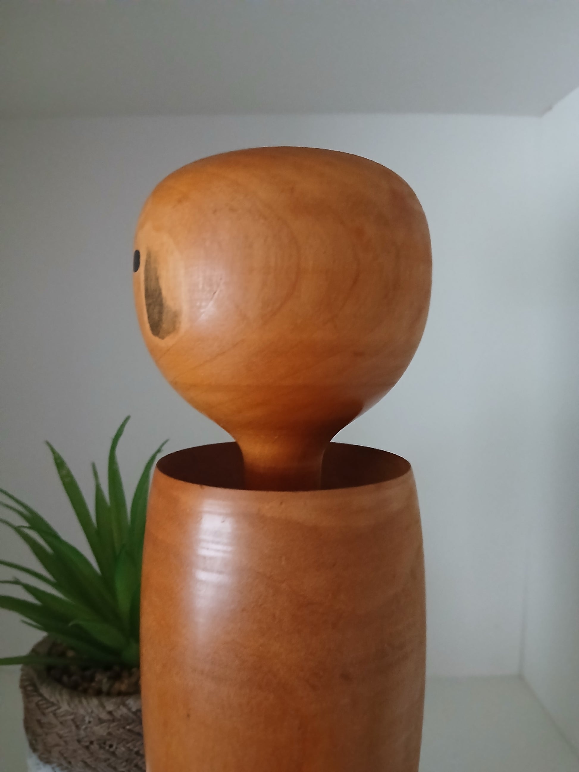 kokeshi doll by renowned artisan Ikuyoshi Yokozuka. Known for his refined and modern interpretation of traditional kokeshi, Yokozuka’s work is highly sought after by collectors and design lovers worldwide.
